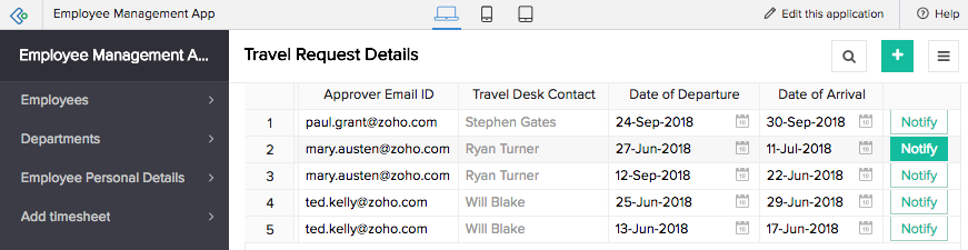 Let's assume, you have an employee management application that has employee related information. In a report that maintains travel requests, the details include the name, designation, and department of the employee who initiated the request, the manager who approves the request, destination, period of travel, the customer/partner/vendor who the employee will meet, and the travel desk that facilitates the journey. Let's say there is an action item called Notify All in the report. On completing the arrangements for the travel, the travel desk person will have to provide intimation to the concerned employee and the manager. The predefined menu item encapsulates a workflow that triggers email notifications to the concerned parties with details of the travel date and the complete schedule for the travel. When the travel desk person clicks the Notify All button, the intimation email gets sent to the employee, the manager, and the customer.