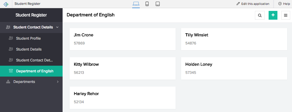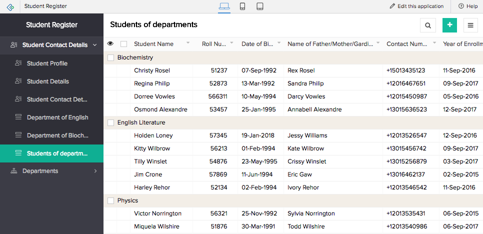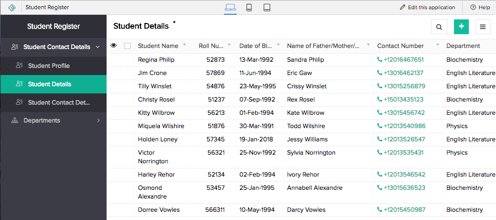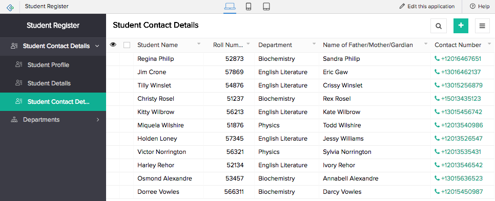ManageEngine AppCreator offers a range of functions to help create efficient, functional reports that fulfil specific business needs. You can use charts, diagrams, images, and audiovisual files, create criteria to filter information, arrange data by category, and use charts, diagrams, images, and audiovisual files. You can also create more than one report based on a single form. For instance, if you have a form that gathers complete student profiles, your default report captures all the information. However, you can create multiple reports using this one form, for example: