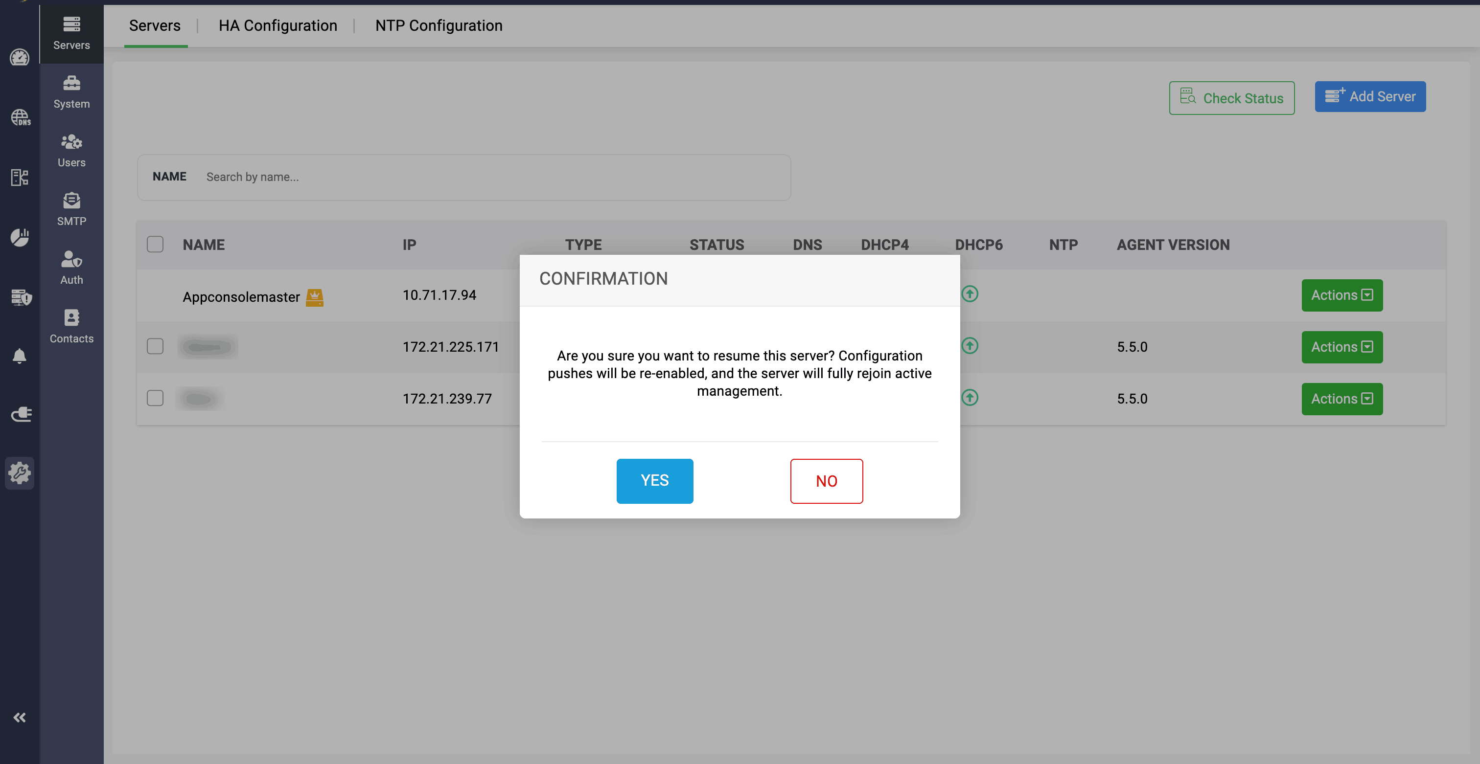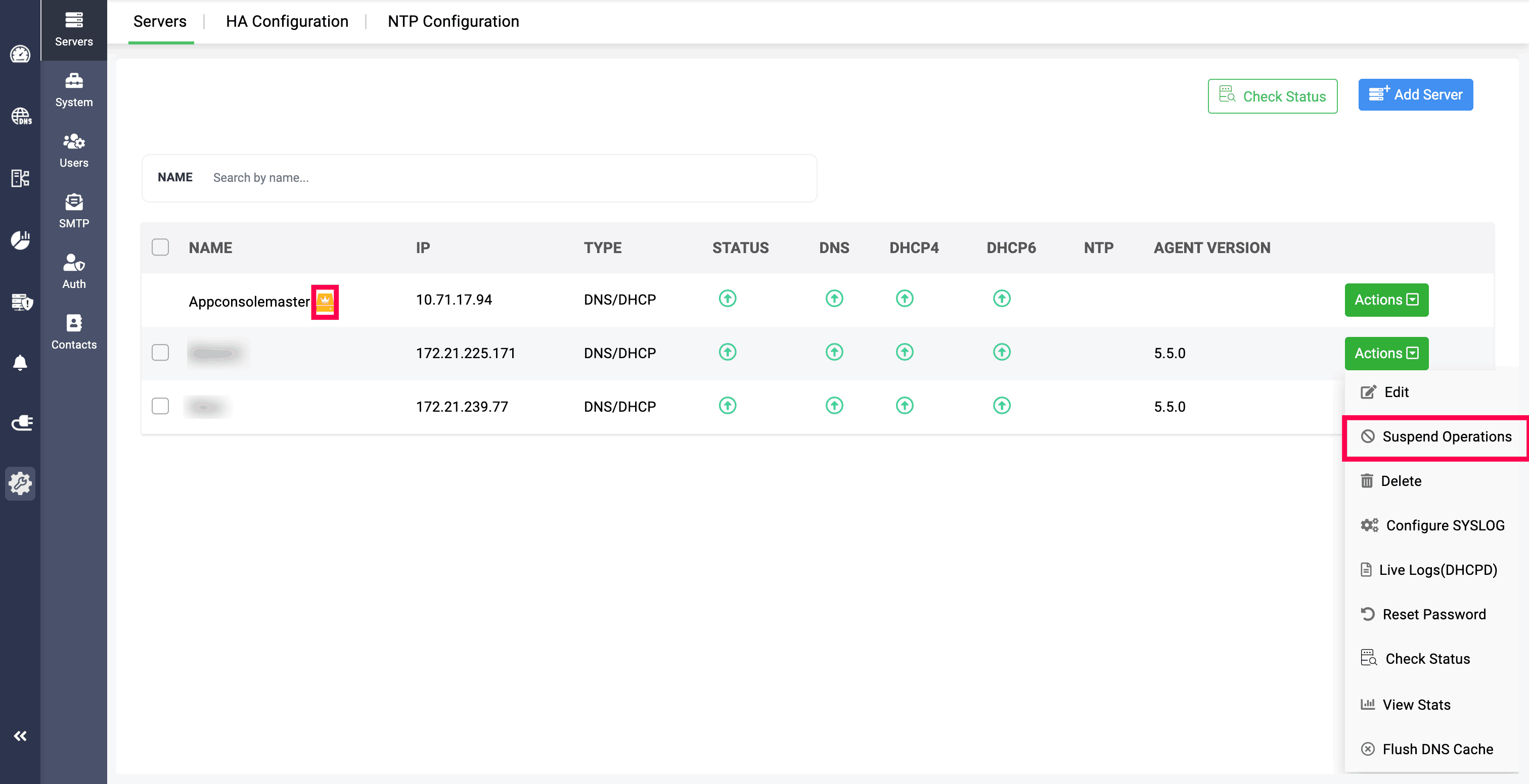 Both DNS and DHCP servers within a cluster can be suspended from providing further updates to the app console UI, by going to Servers>Actions, and clicking on Suspend option in the dropdown menu.