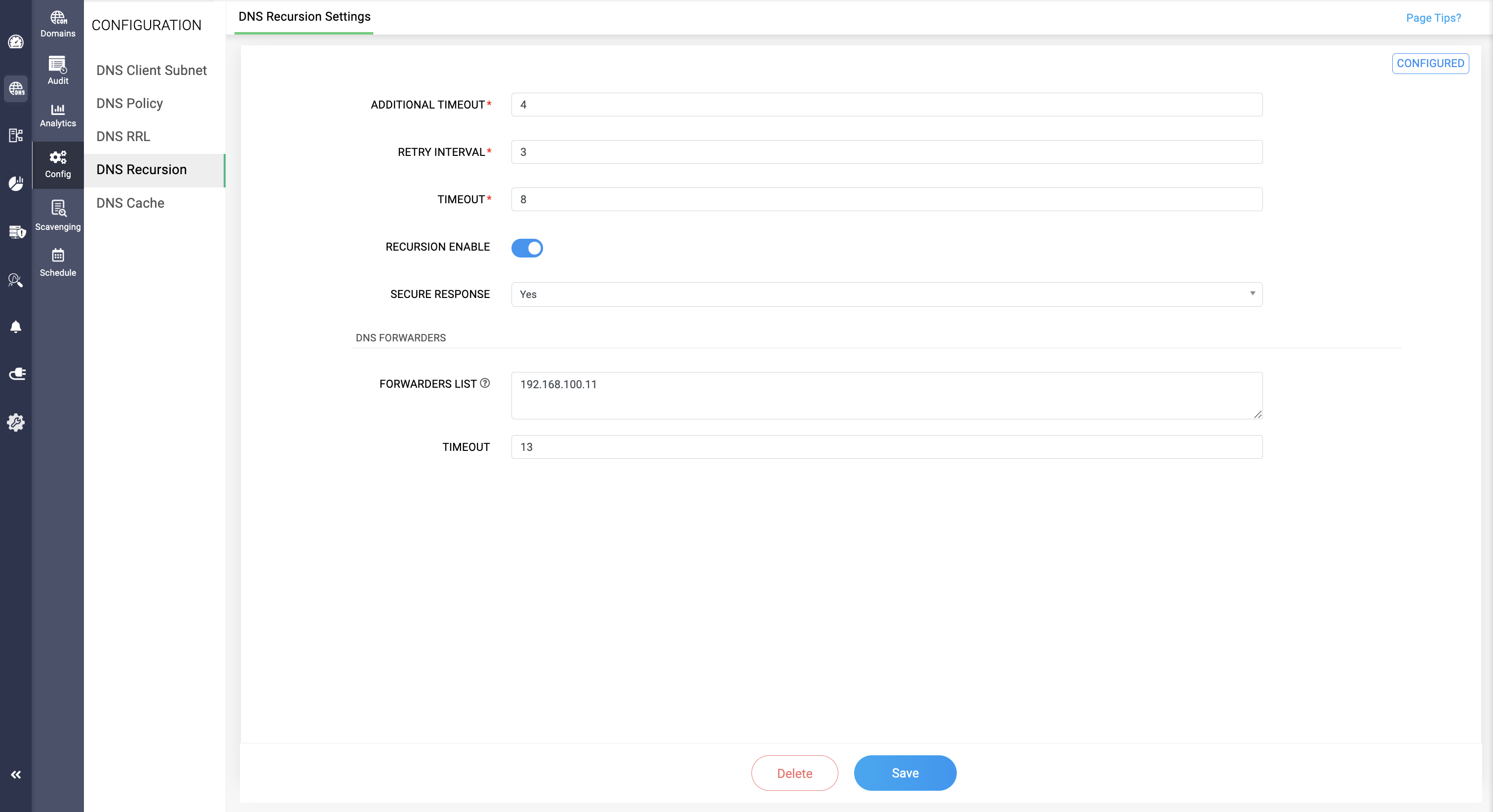 - On the Configuration page, navigate to the DNS Recursion tab.