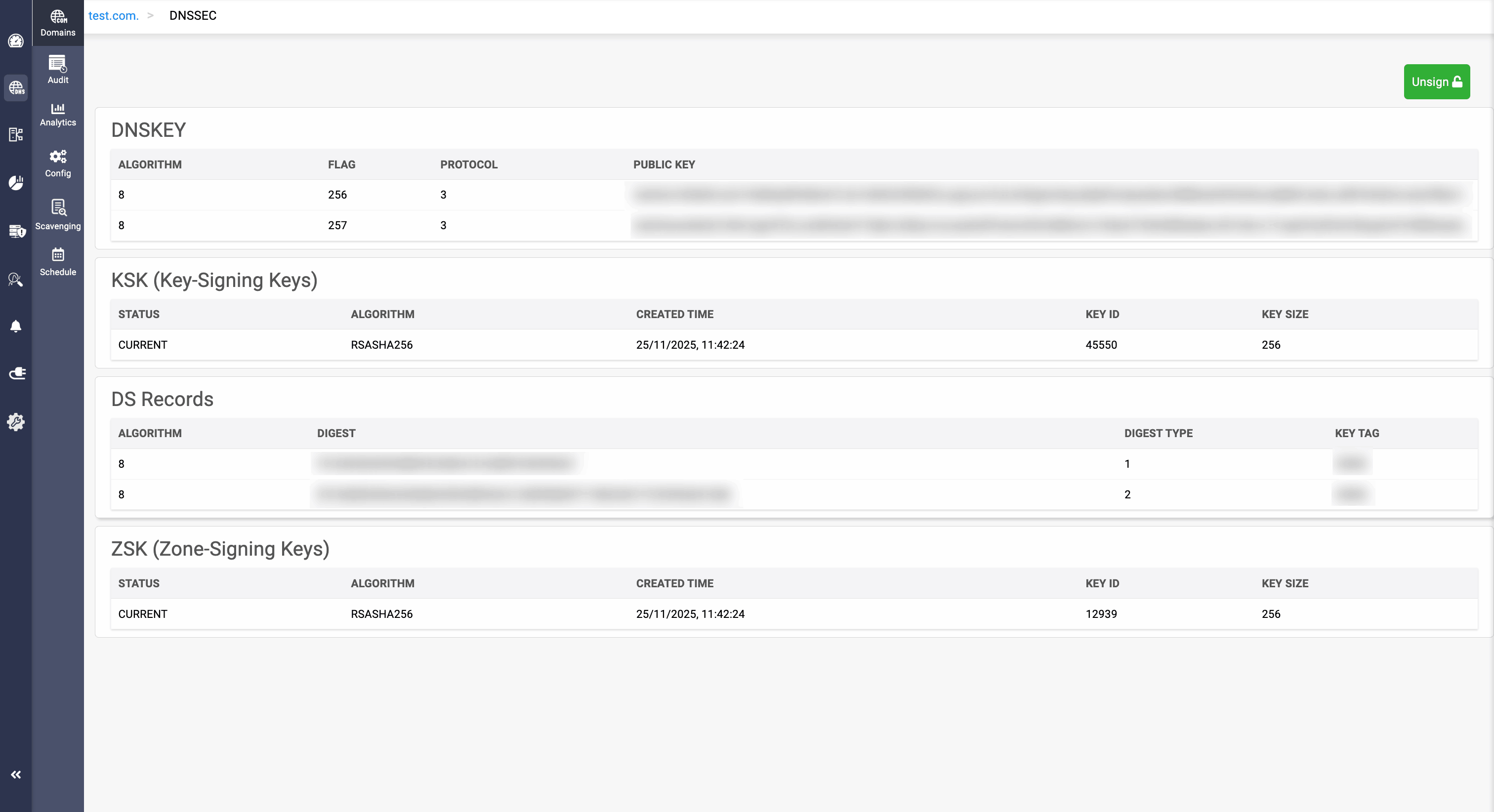 • You can also revoke DNSSEC for a particular zone by clicking the Unsign button at the top right corner.