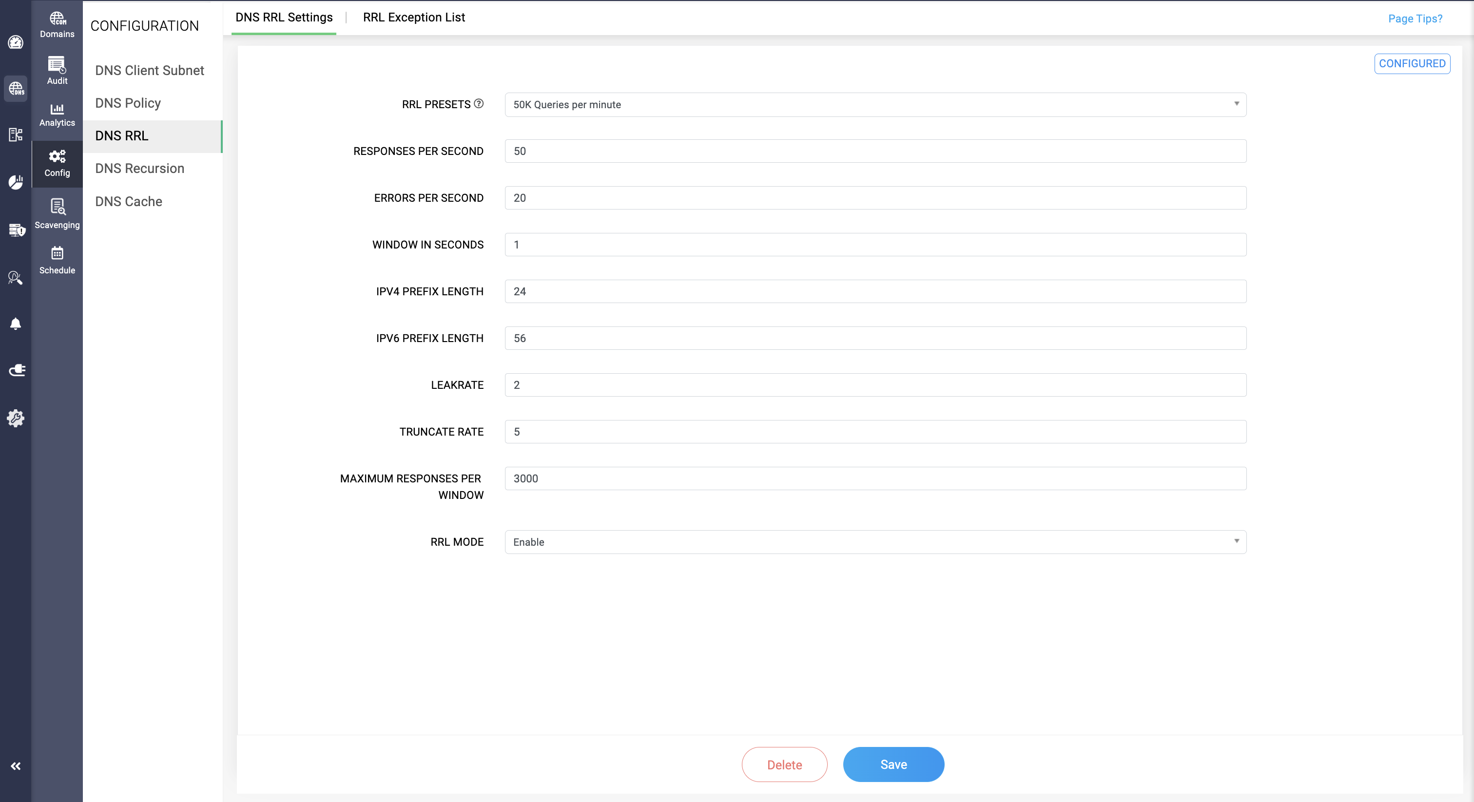 Response Rate Limiting (RRL) is a security feature designed to mitigate the impact of DNS amplification attacks by limiting the rate of responses a DNS server can send to a client. Configuring RRL settings helps protect your DNS infrastructure from abuse and ensures fair usage.
