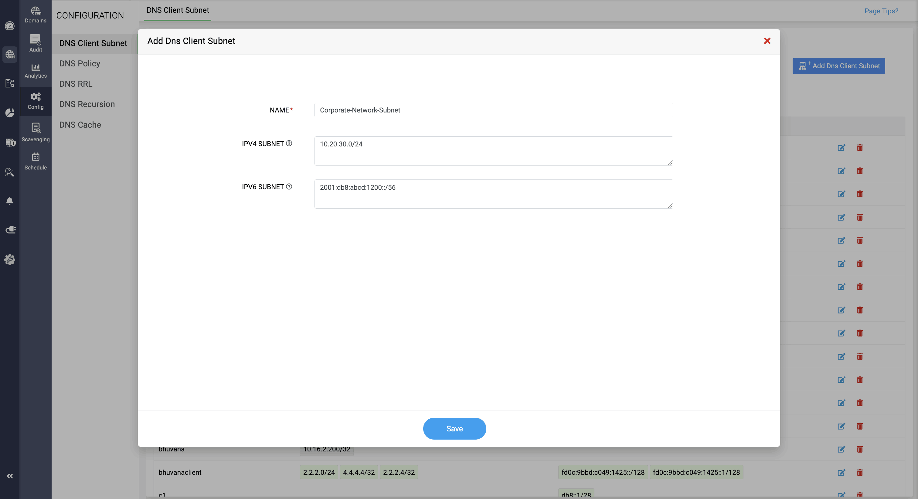 Creating client subnets involves defining a named group of IP subnets. Here’s how to create client subnets in DDI Central:
