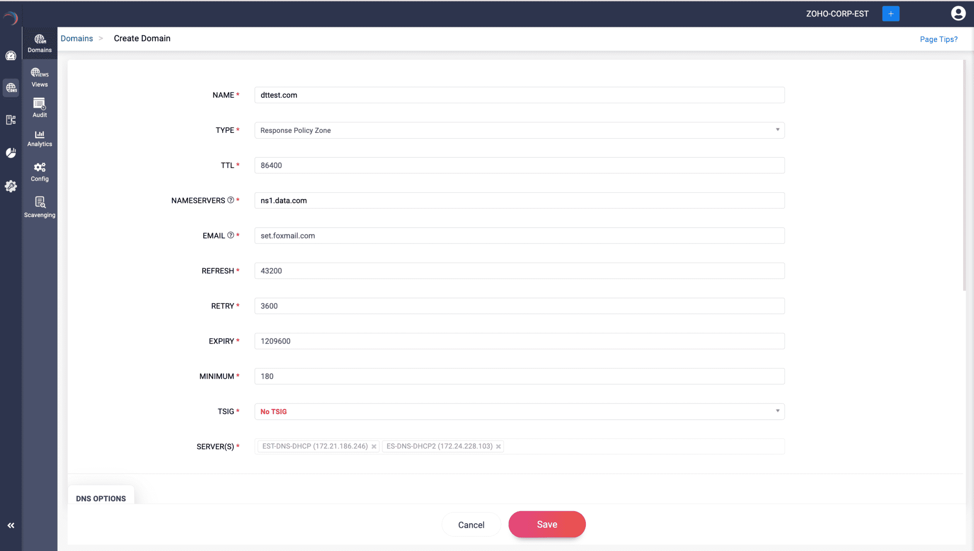 • On the Create Domain page, Choose the type of the domain as Response Policy Zone (RPZ).