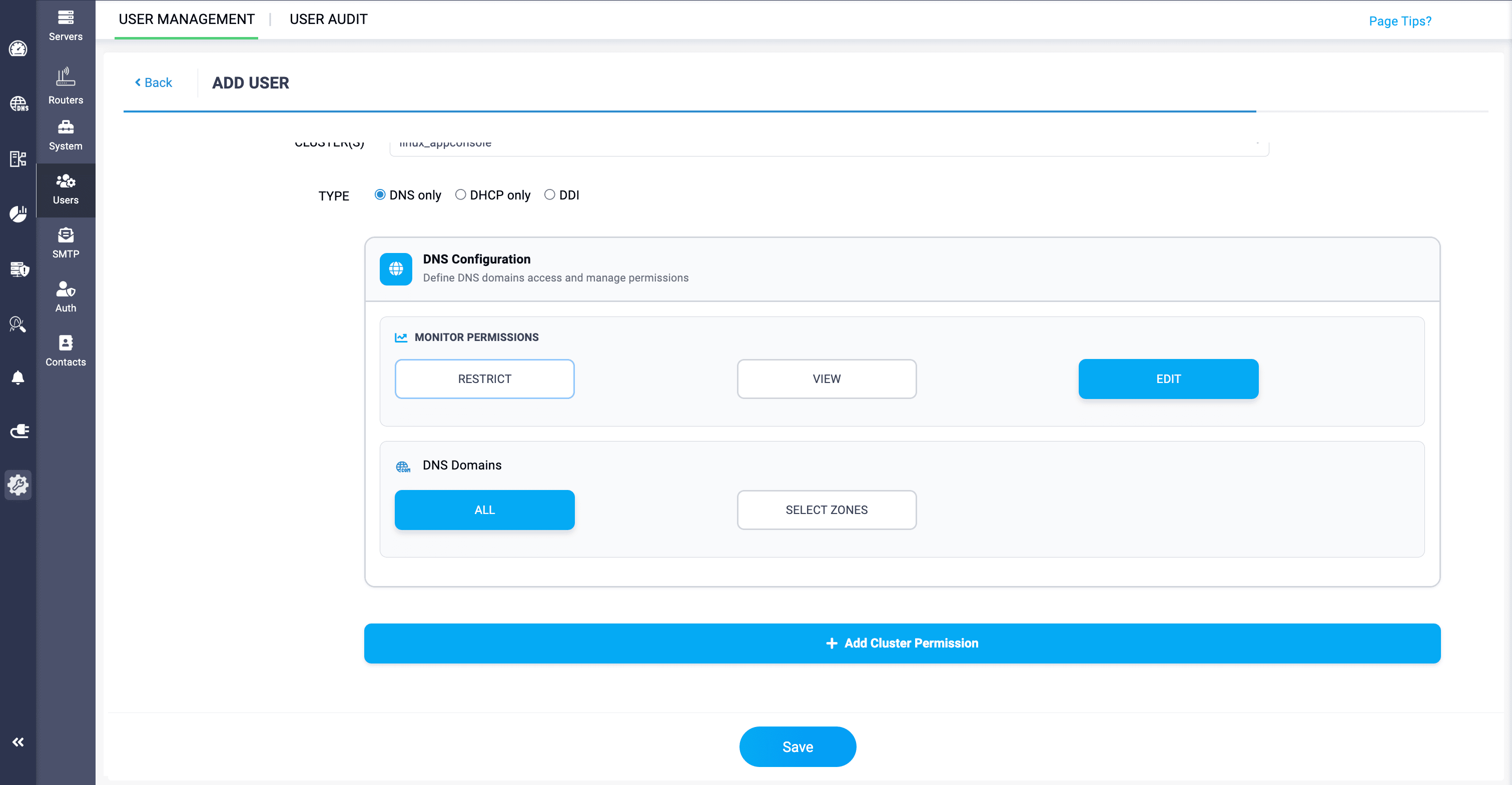 • Under the DNS configuration section we have MONITOR PERMISSIONS, where you can prevent the user for accessing the monitors with RESTRICT option, or you can just let them view the monitors in the network with VIEW option, or you can allow them to edit the monitors with the EDIT option.