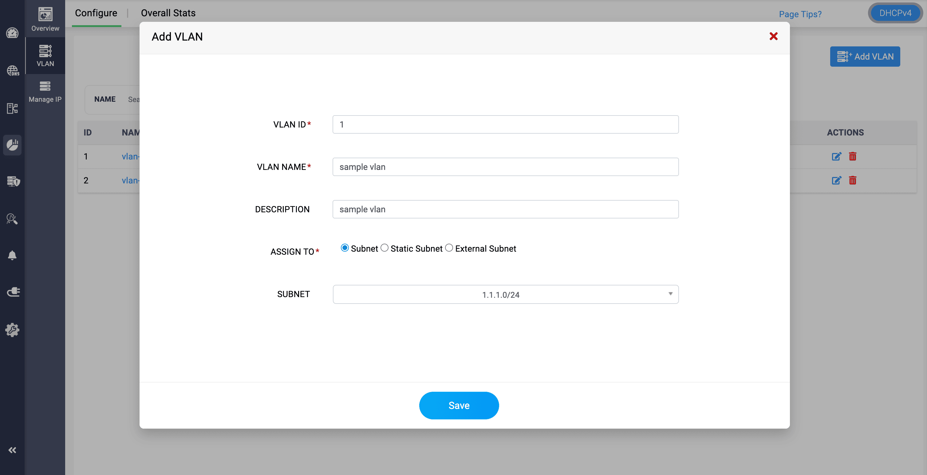 Assign Existing VLAN: Enable the Toggle to assign the subnet to an already defined VLAN.VLAN ID: Numerical ID for the VLAN to which this subnet is tied.VLAN Name: Descriptive label for the VLAN (optional, for clarity).Pool Data