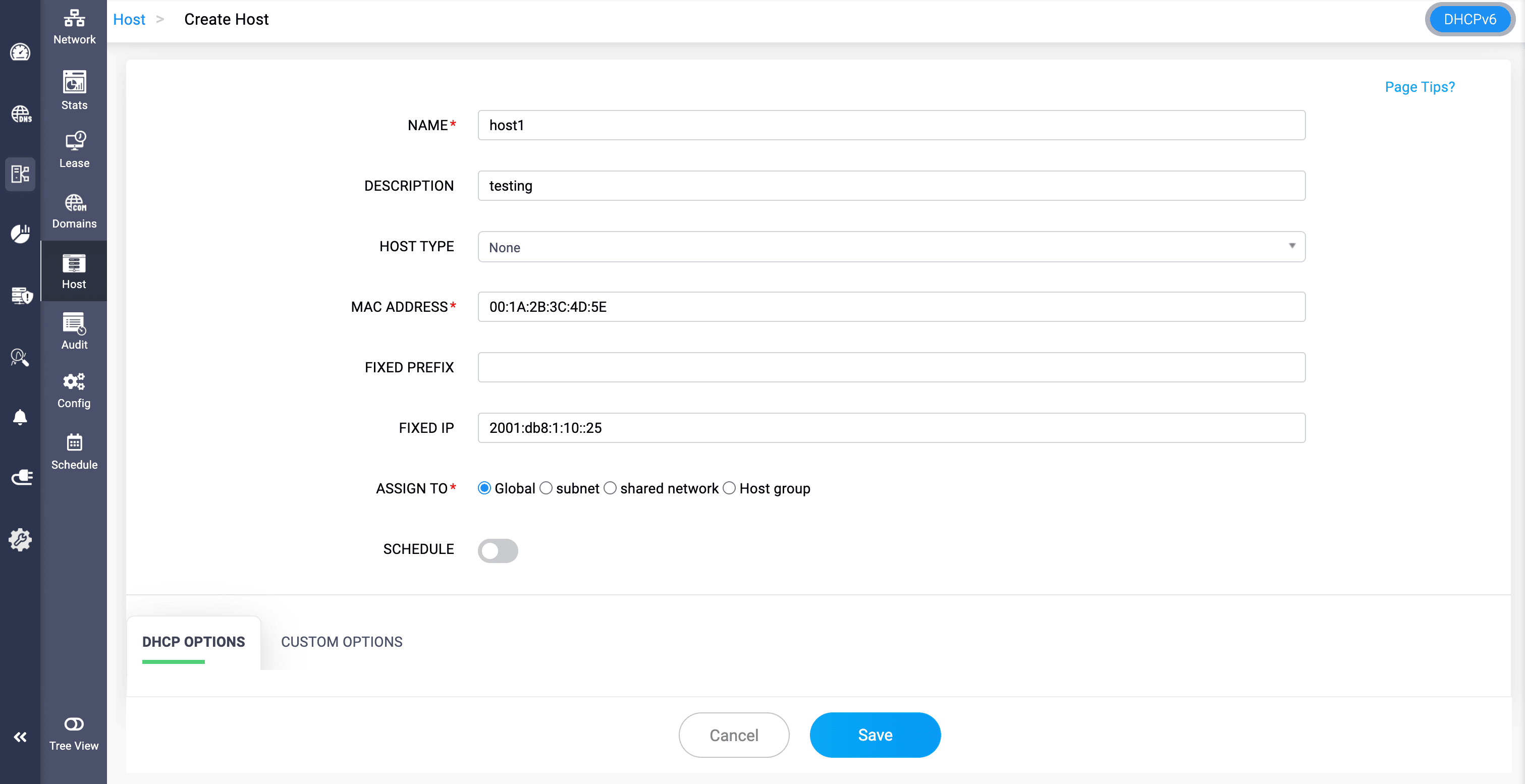 MAC ADDRESS*: Enter the MAC address of the device for which Fixed IP address is to be assigned. Required only for the relevant host types where the selected host uses MAC address. The Field may vary depending upon the host type selected.FIXED PREFIX: Enter the IPv6 network prefix that should be assigned to this host (e.g., 2001:db8:abcd::/64). Useful for DHCPv6 prefix delegation scenarios.FIXED IP: Specify the fixed IPv6 address you want this host to receive.ASSIGN TO*: Define the scope or context to which this reservation applies.Options include:
