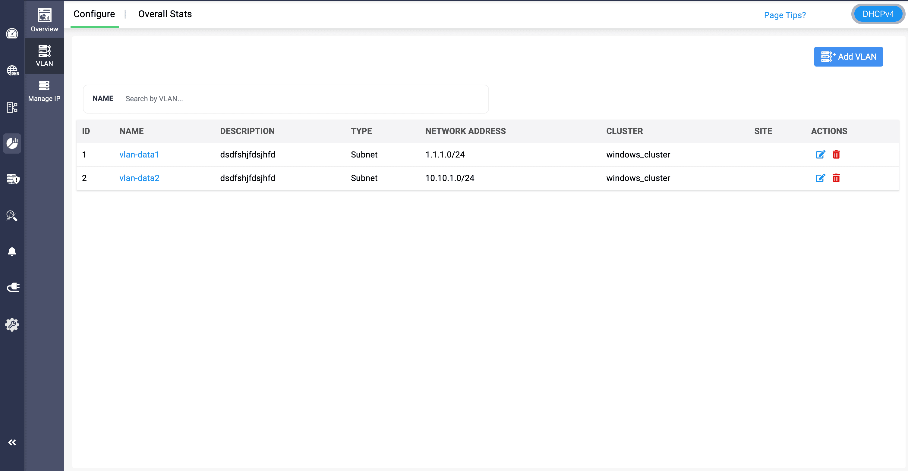 Note: The DHCP subnets can be managed and unmanaged by clicking on on the icons next to Clear Lease Data, Edit, and Delete. Subnets that are exceeding the limit that's given in their licensing can be unmanaged. Click here to