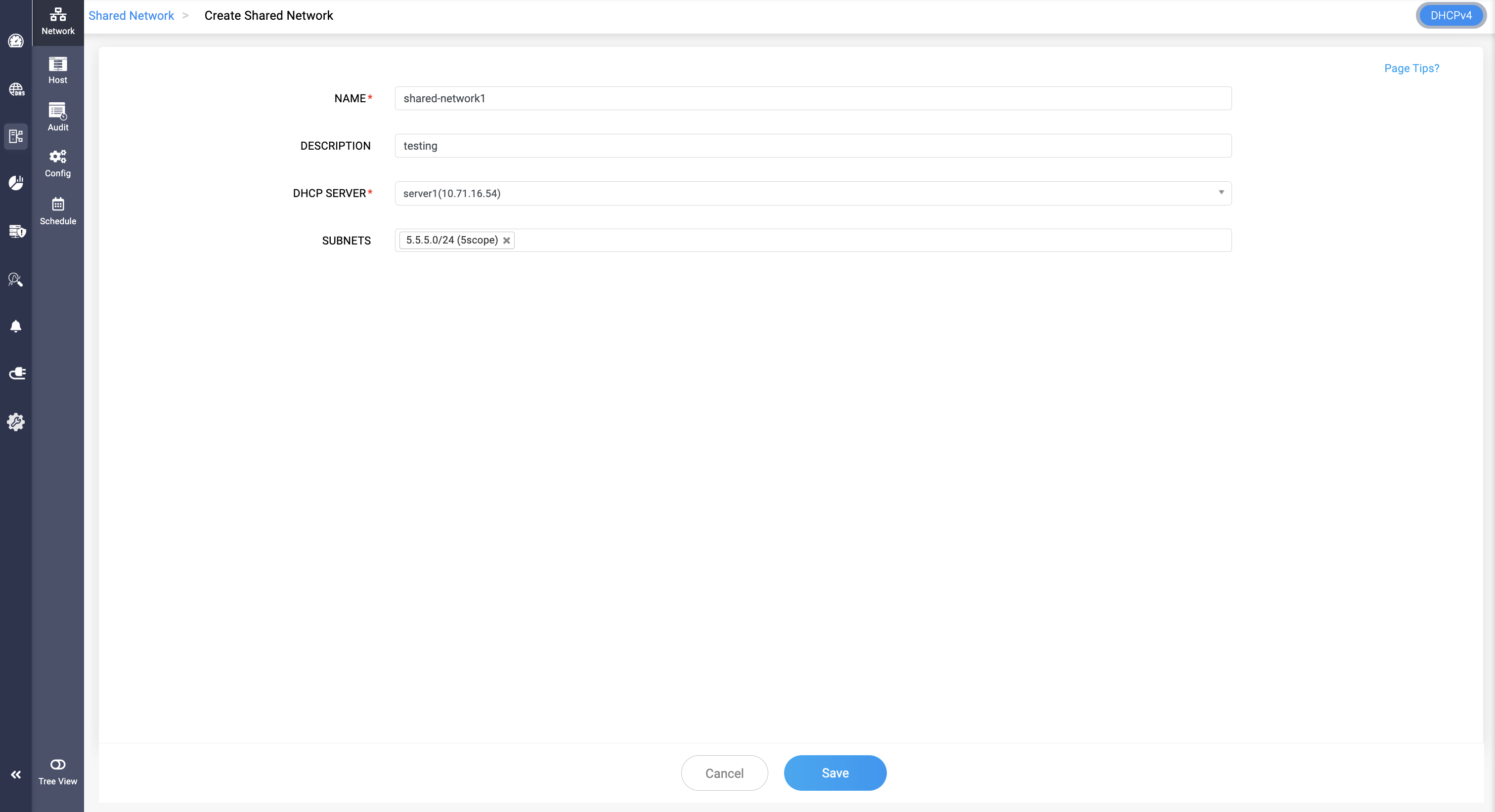 To create an IPv4 subnet, go to DHCP-> Network-> Subnet. Click Add Subnet button in the top right corner. Make sure DHCPv4 is selected from the toggle in the top right corner.