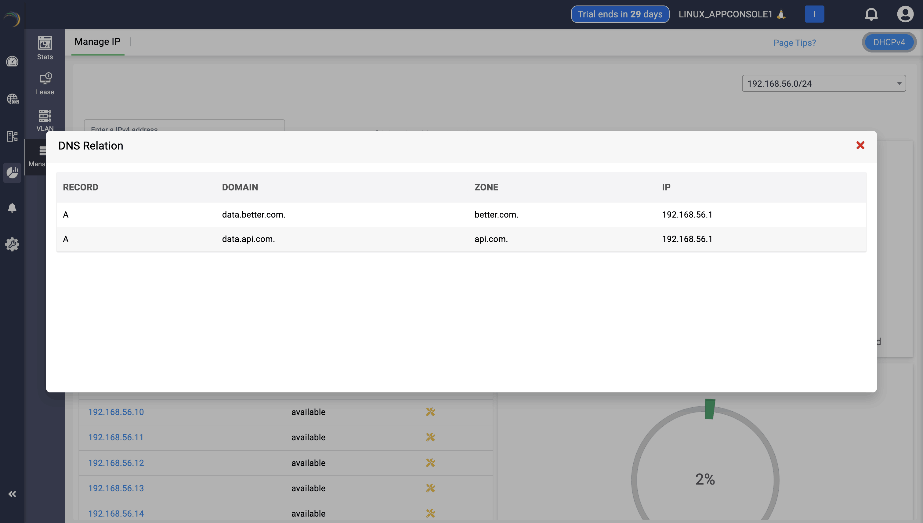 DNS relation option can be viewed along with Telnet and Ping when clicked on the yellow icon. Clicking on the DNS relation will display the the status of the IP/host, the domain associated with, the record it has been mapped, and the zone associated with the IP through the DNS relation table, helping users to have a clear visibility. Its important to note that when a PTR record is associated with the IP/Host, it will be displayed in the table, and wont be shown if there is no PTR record associated.