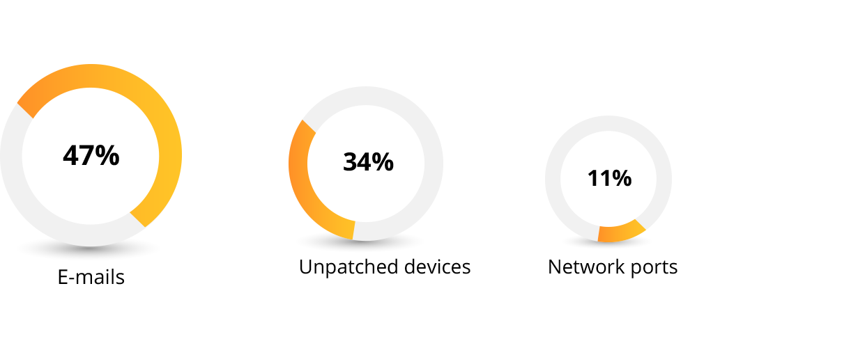 The scope and source of cyberattacks is quite vast due to widespread internet access and constantly evolving techinology. However, during our study, we were able to identify a few prominent areas where cyberattacks typically penetrate corporate networks. Emails are the top source of cyberattacks, followed by distributed devices.