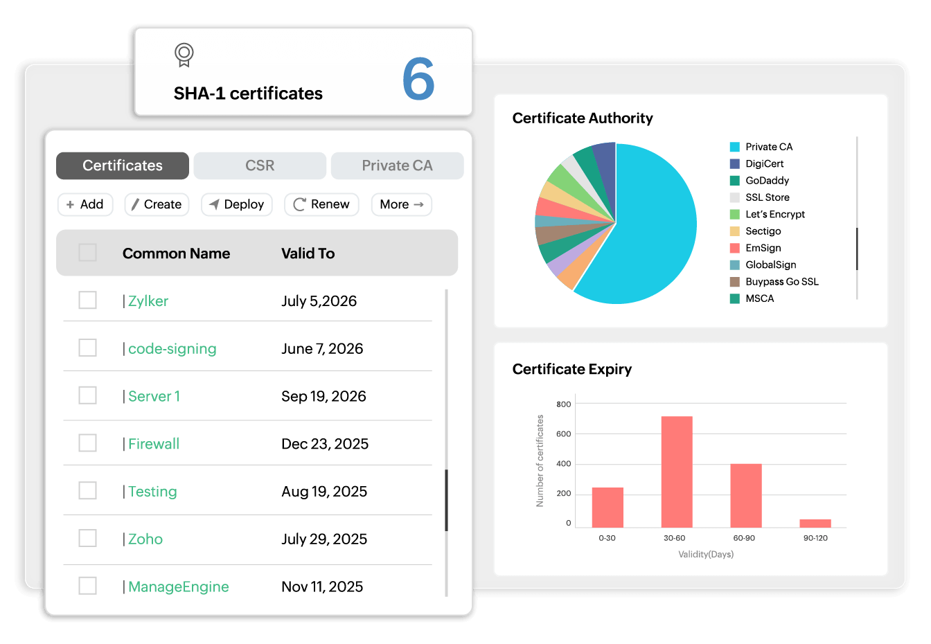 Key Manager Plus consolidates all certificates into a single platform regardless of issuing authority. Manage certificates from public CAs, private CAs, Microsoft Certificate Authority, and self-signed certificates in one unified console with complete visibility and control.