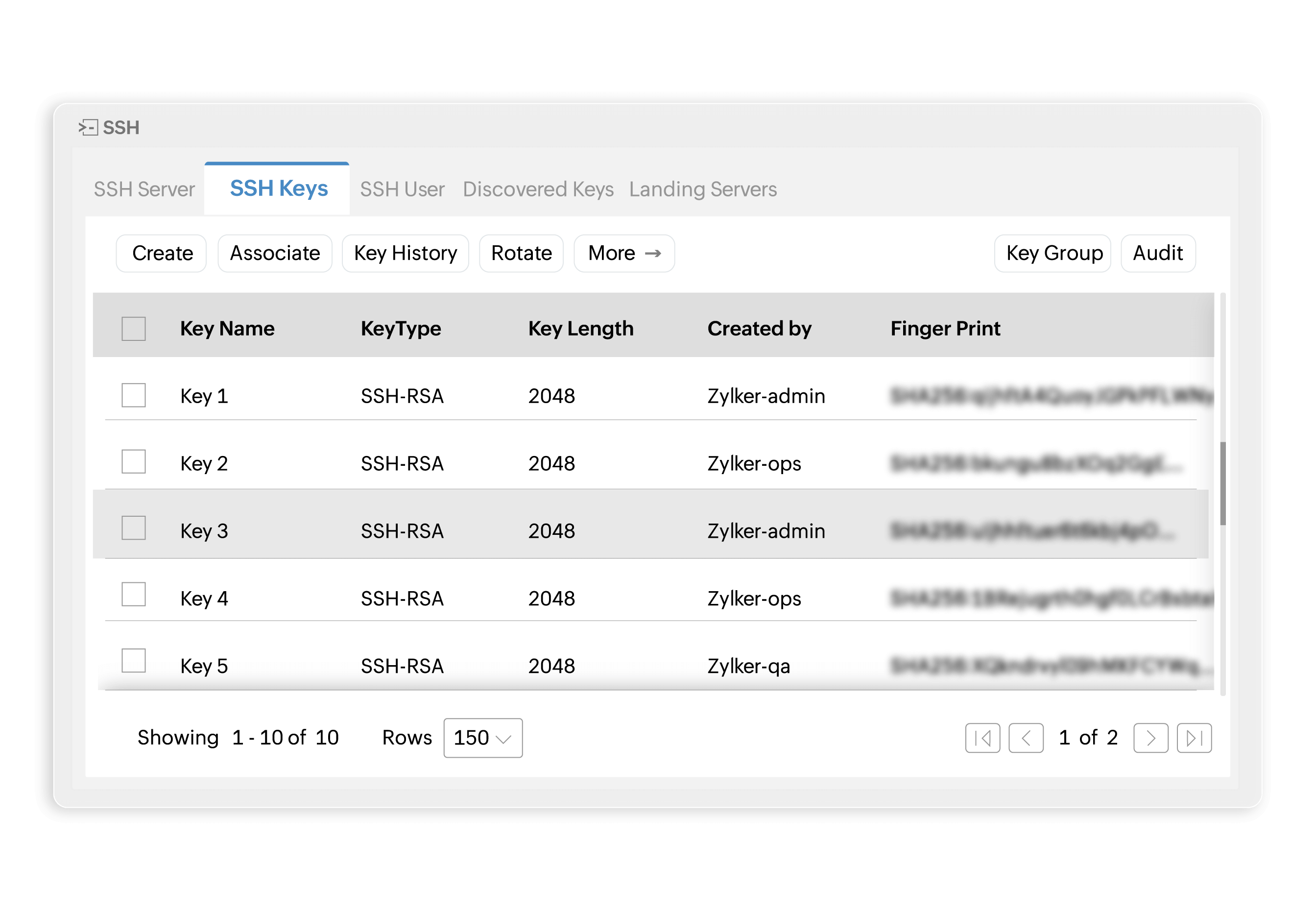 Gain comprehensive visibility of all your SSH keys from a single console. Key Manager Plus discovers and inventories keys across your infrastructure, along with critical information like their associated SSH users, deployment status, location, and usage history. The discovery process can also be automated using Key Manager Plus' customizable scheduling options, ensuring continuous oversight of your SSH key infrastructure.