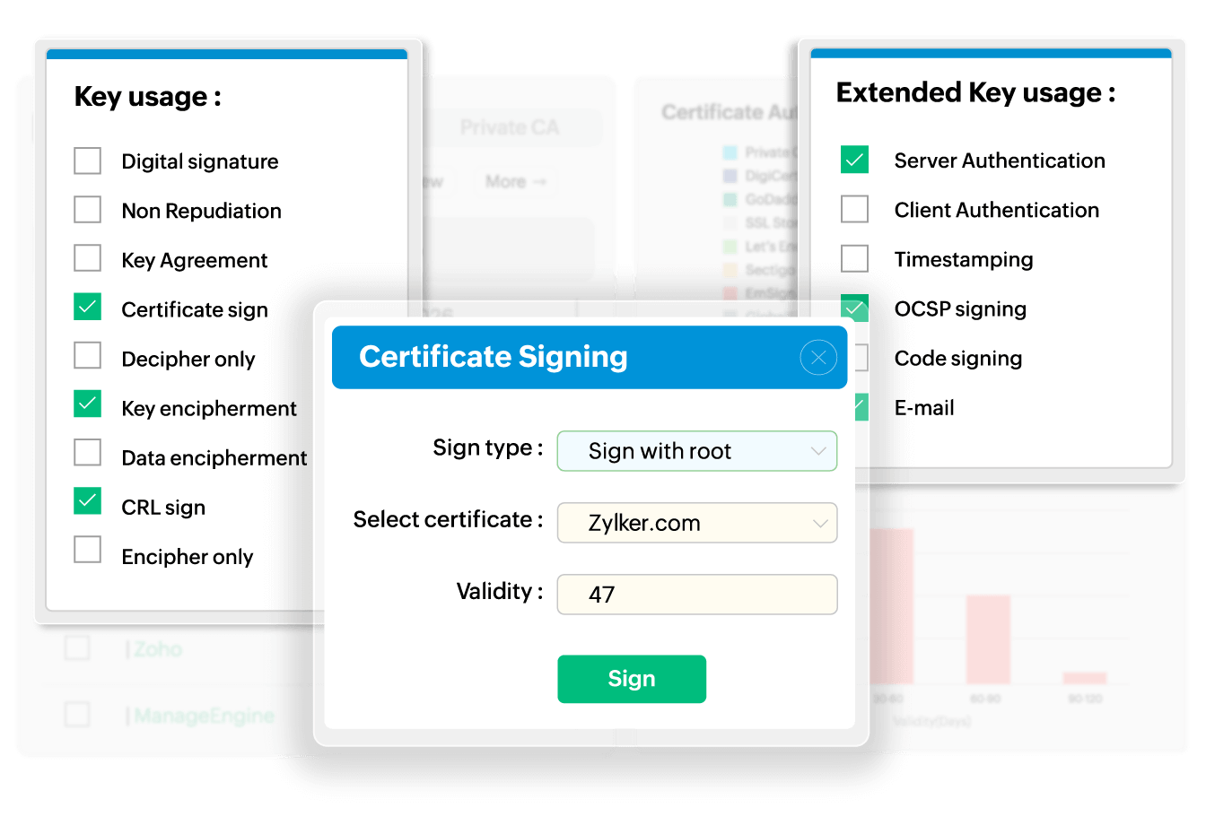 Establish your own certificate hierarchy by generating new root certificates or designating any existing certificate as a root CA. Use these custom root CAs to sign certificate requests individually or in bulk for internal systems and applications. You can also configure advanced key usage properties to define specific purposes for each signed certificate. This approach gives you complete control when issuing internal certificates.