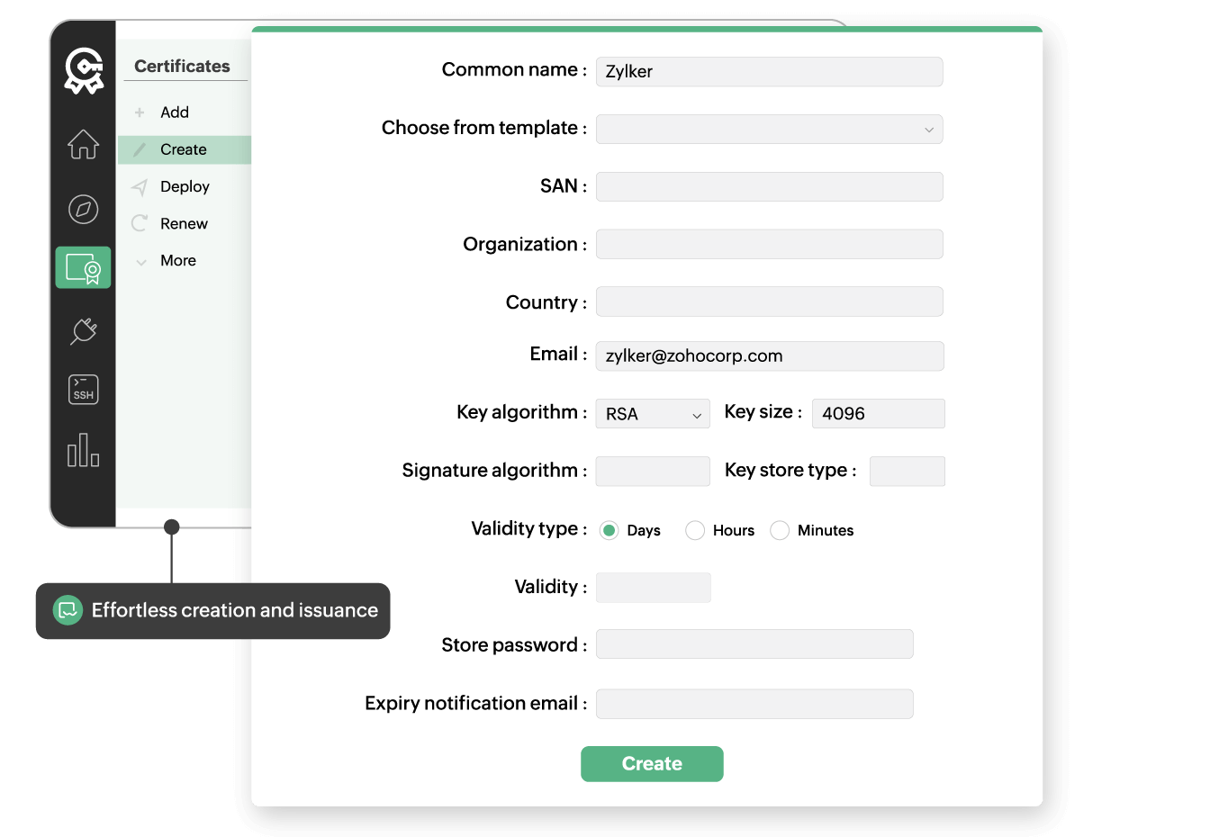 Effortlessly order new certificates from all major CAs and create internal certificates.