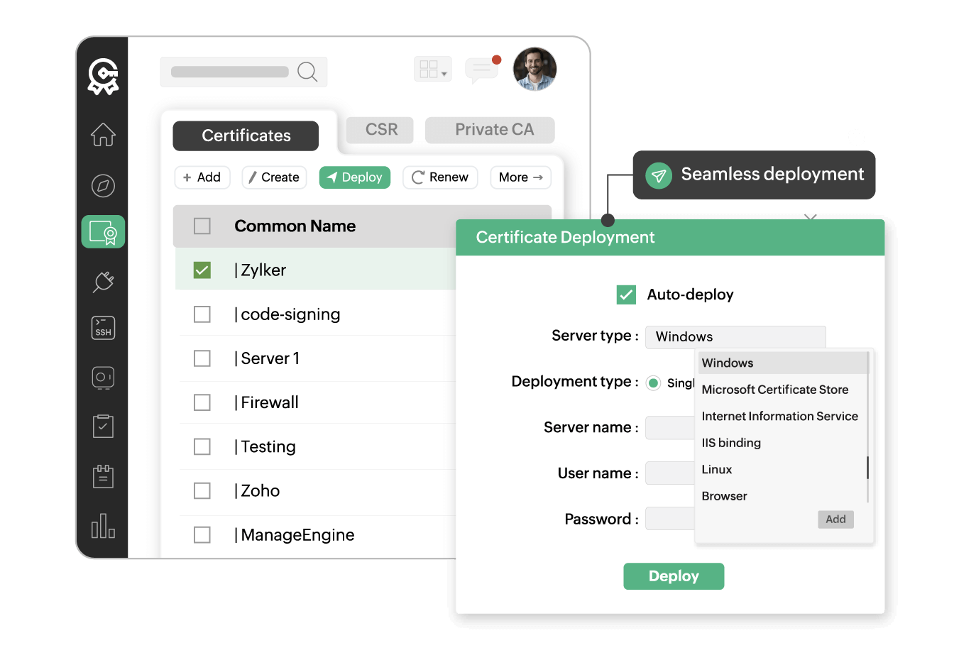 Automatically deploy certificates to target servers across your enterprise infrastructure.