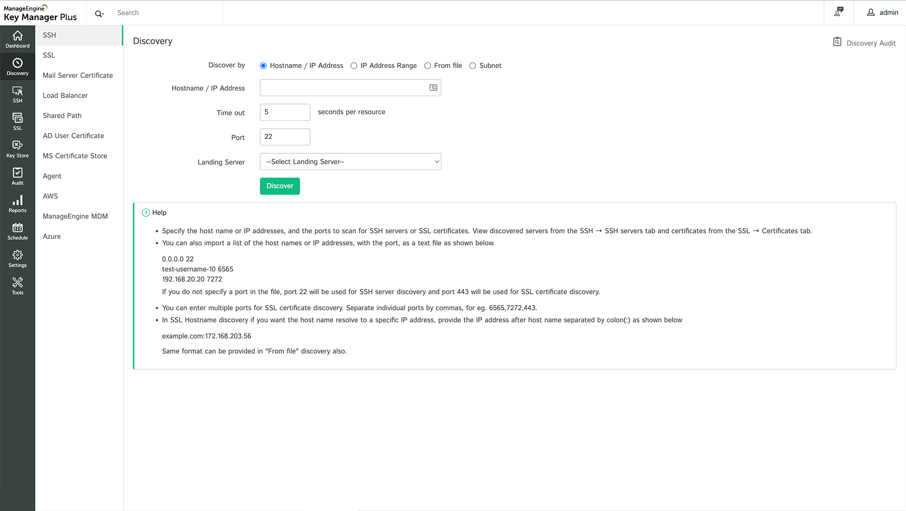Key Manager Plus provides you with the flexibility to automate the discovery of multiple resources from varied locations as well as import a list of resources in bulk. It supports on-demand, scheduled, and recurring discovery processes, presenting you with a detailed overview of each executed discovery.