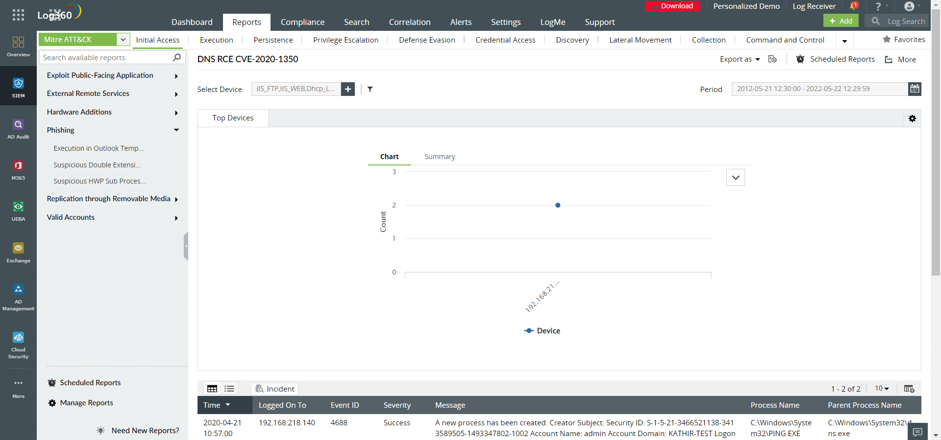 A SIEM solution like ManageEngine Log360 comes equipped with reports that can help security analysts easily spot malicious activities that could indicate phishing or ransomware attacks. These include reports like: