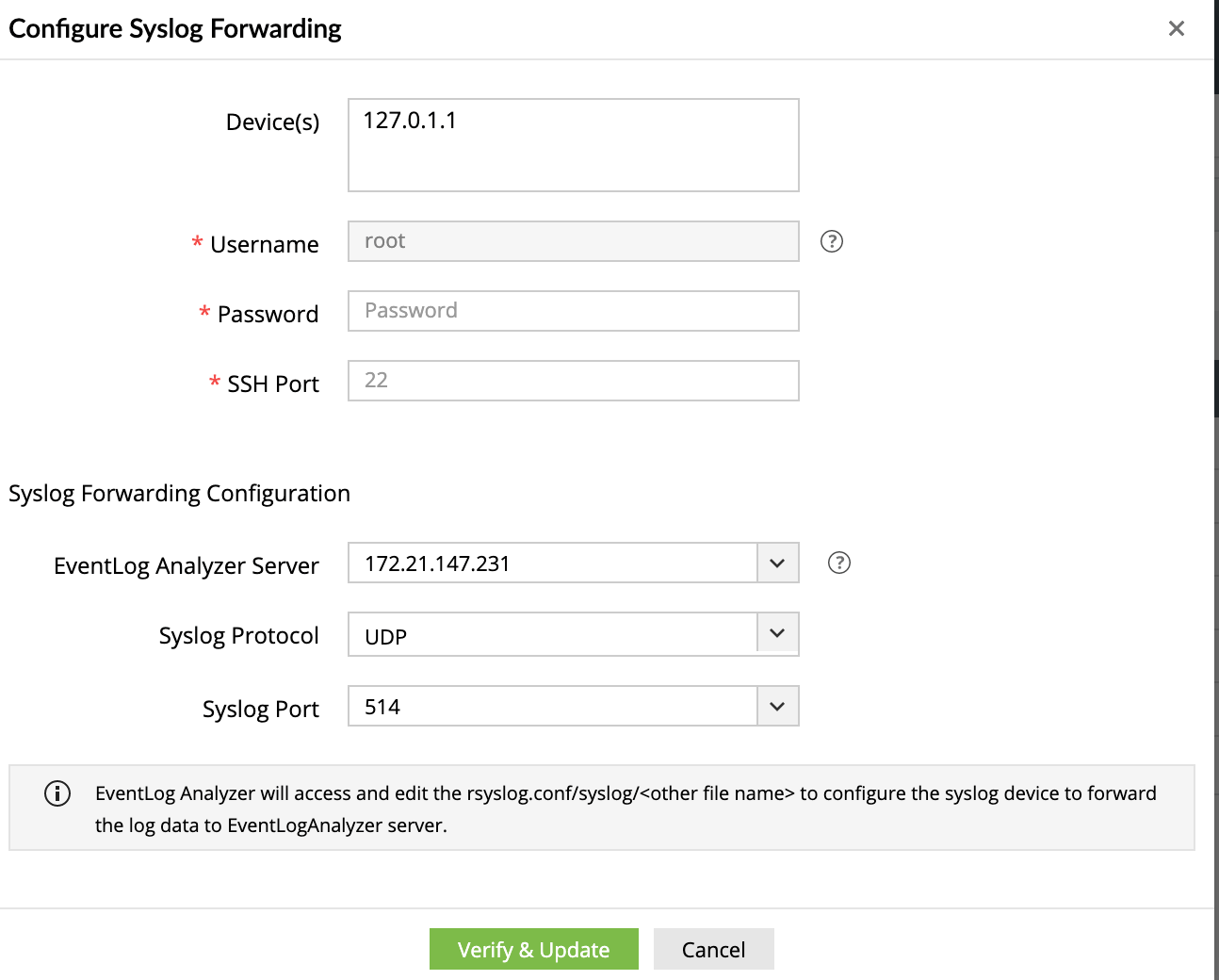 - For configuring syslog forwarding , enter the IP address of the EventLog Analyzer server.