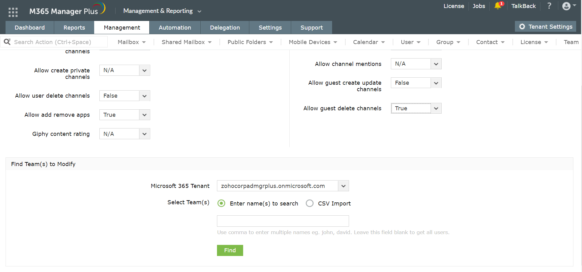 - Navigate to the Management tab and select Team Management under Microsoft Teams.