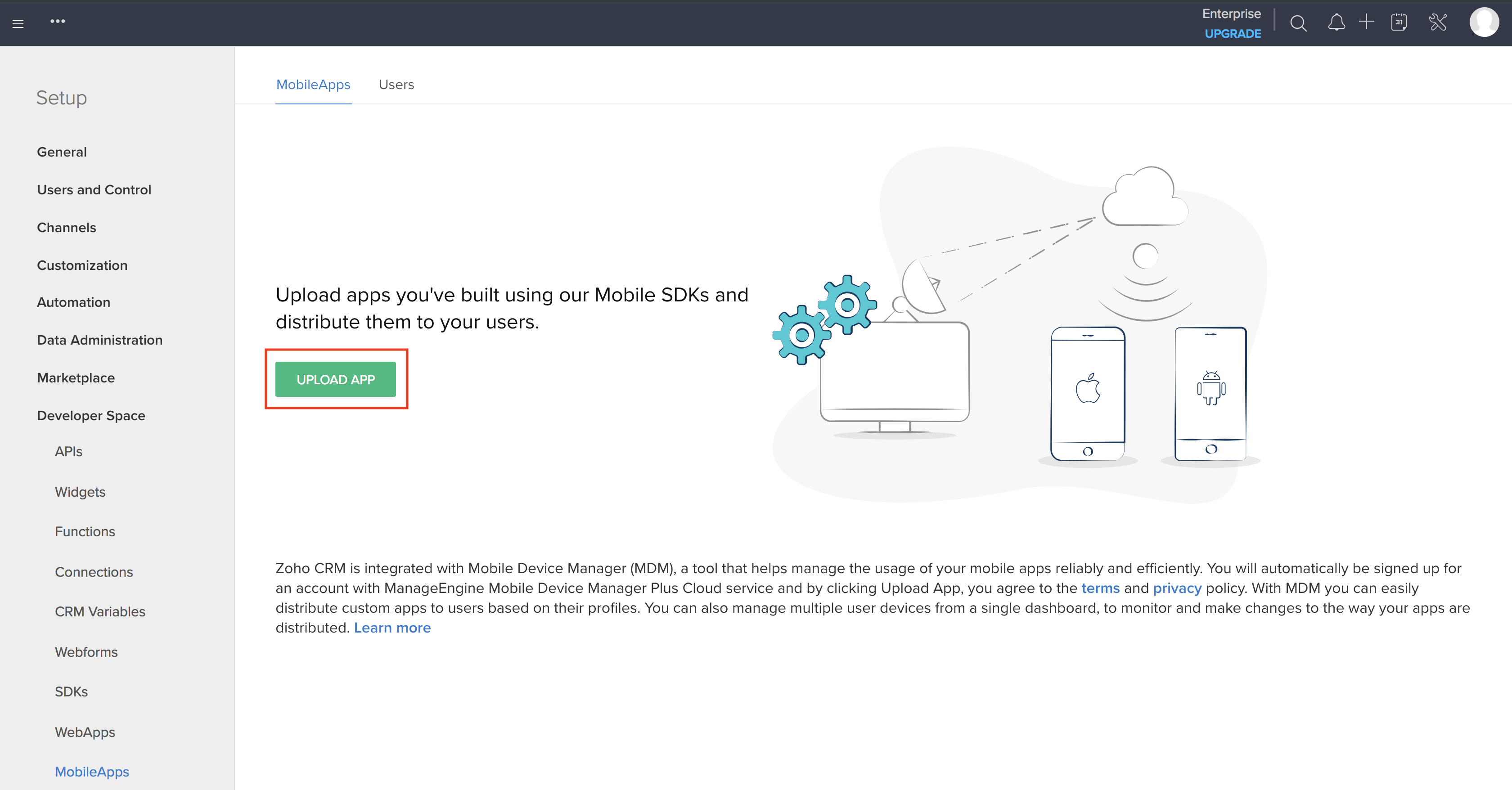 - Now, click on Upload App and you will be redirected to MDM Cloud, where an account gets automatically created using your Zoho account.