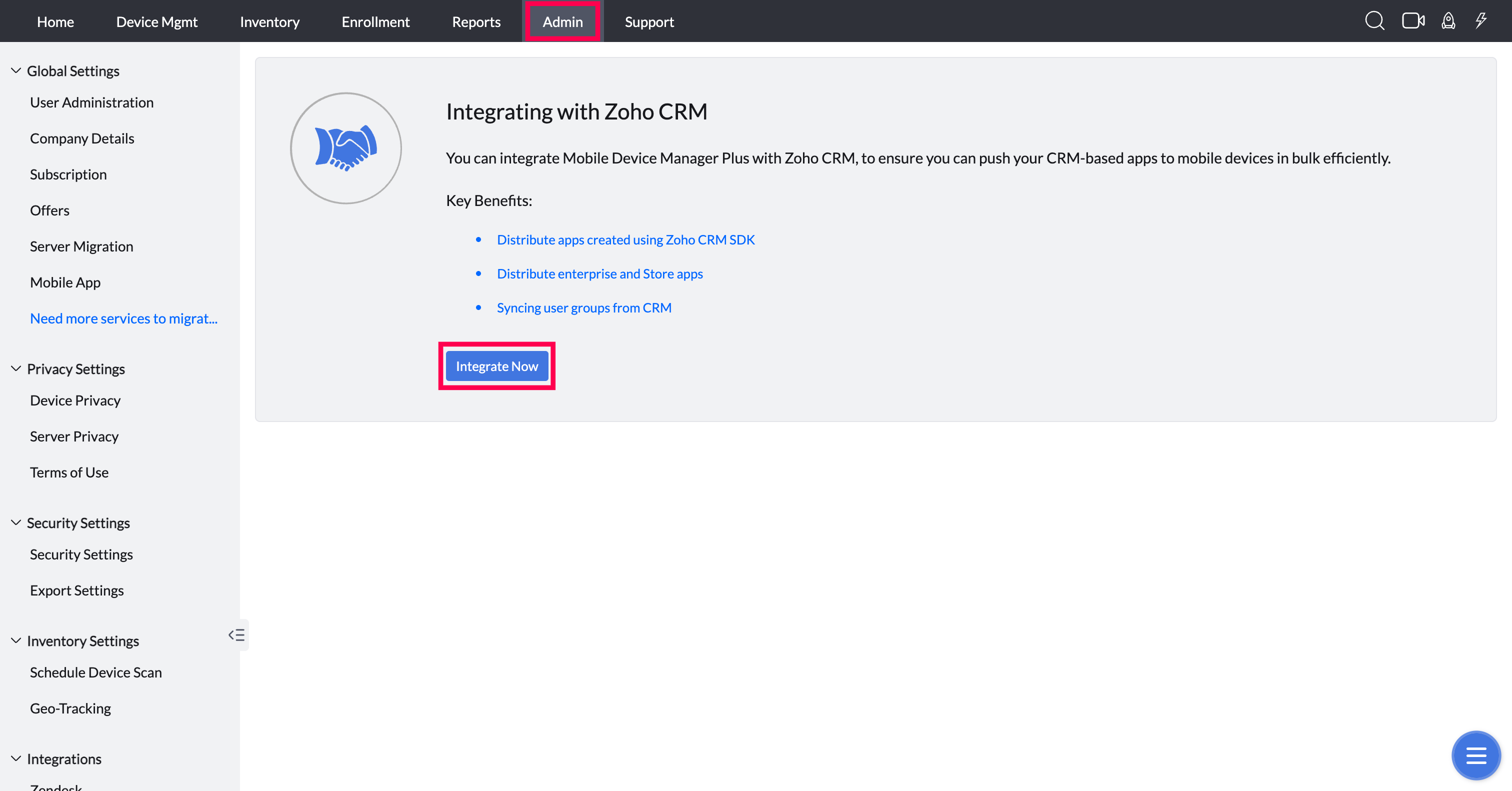 - On the MDM server, click on Admin tab from the top pane and select Zoho CRM, present under Integrations.