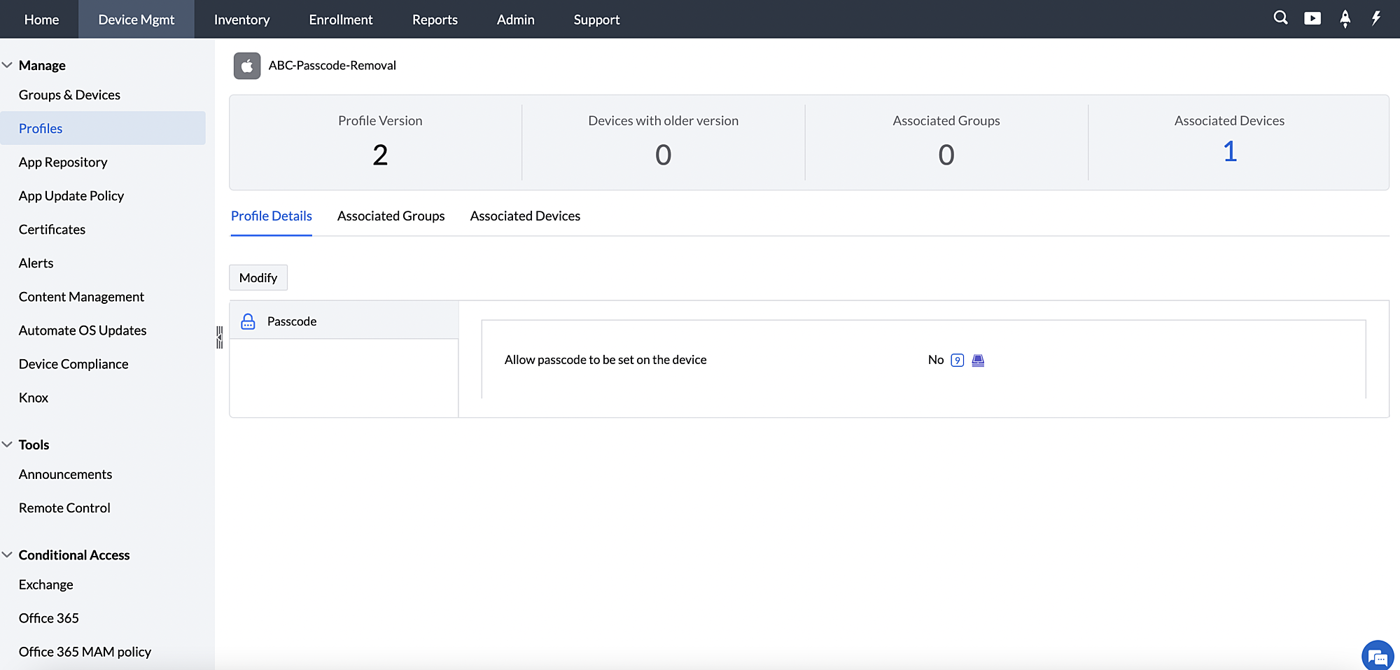 - Go to Device Mgmt -> Profiles, search for the profile name ABC-Passcode-Removal and modifyit.