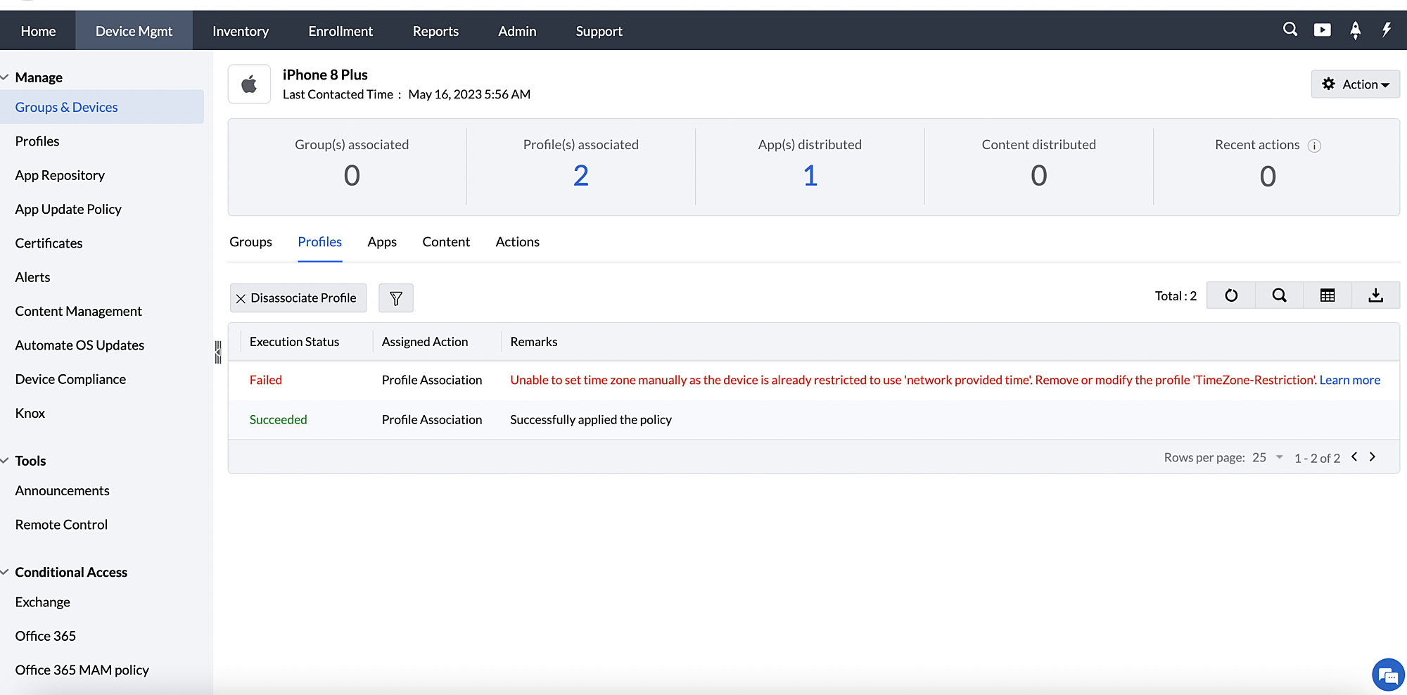 - Go to Device Mgmt -> Profiles, search for the profile name Timezone-Restriction and modifyit.