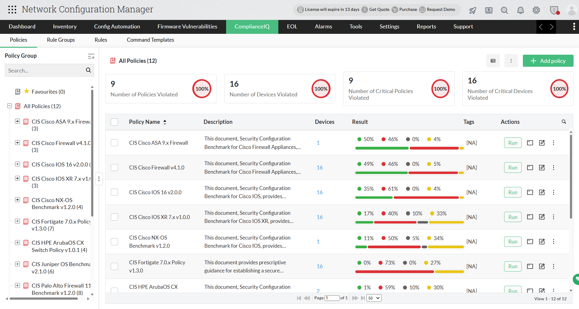 - Compliance maintenance: Network Configuration Manager facilitates adherence to industry standards, such as CIS and other industry-grade policies. By leveraging these policies, users can ensure configurations align with intended rules, mitigating the risk of configuration drift.