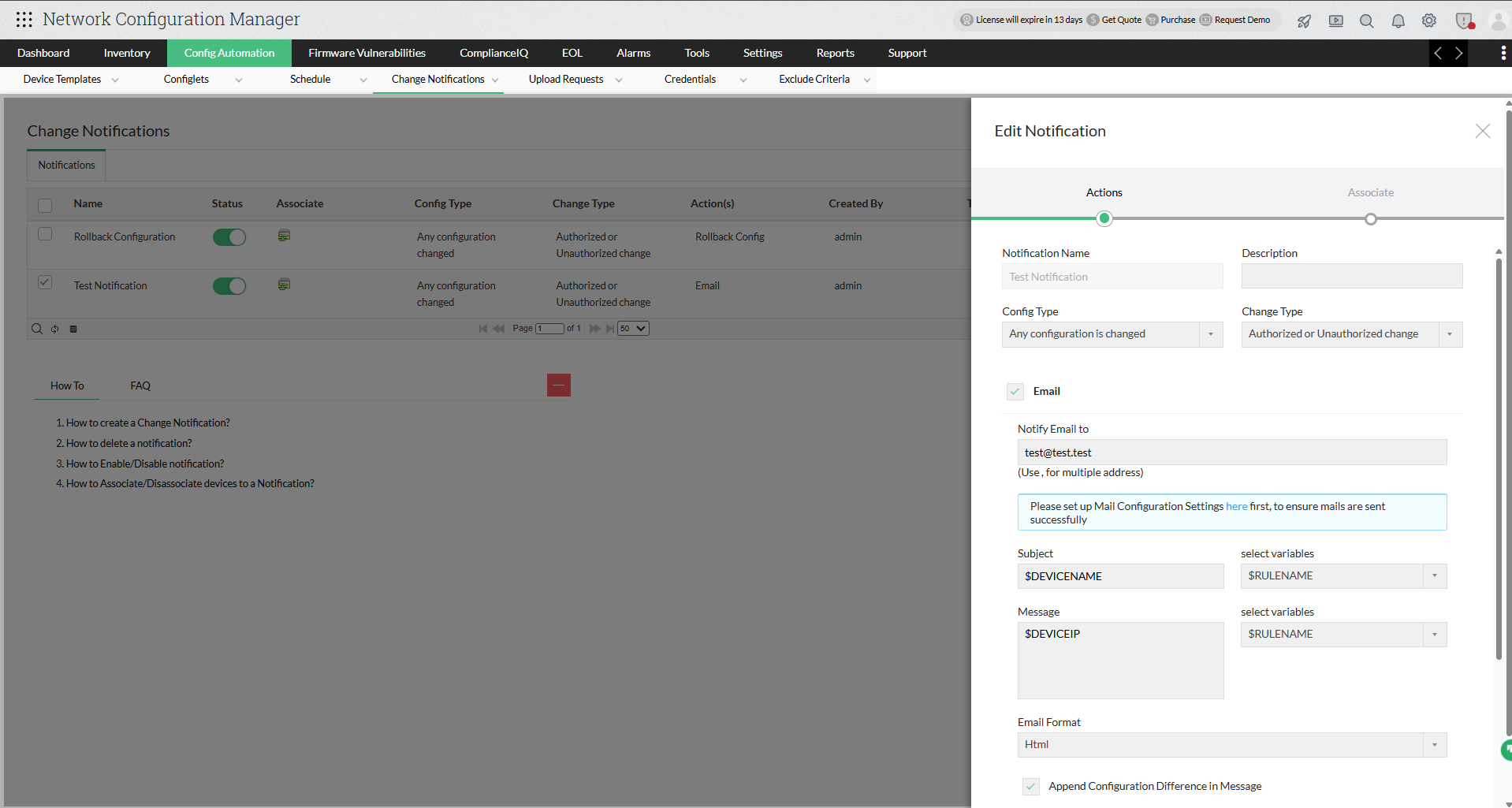 - Real-time change notifications: Network Configuration Manager promptly notifies users of any detected changes to devices through various notification mediums such as email, SNMP traps, Syslogs, and tickets. This enables users to stay informed about changes as they occur, preventing them from evolving into configuration drift and allowing immediate action to be taken.
