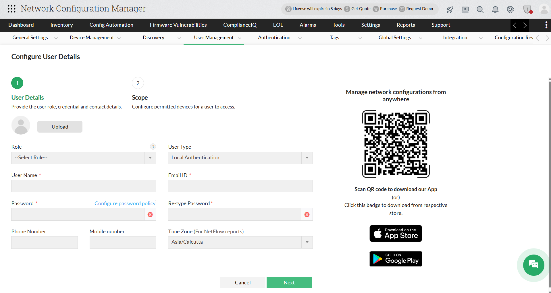 You can create users in Network Configuration Manager and provide access privileges to them. The power to create users is available only for the admin login account and for those accounts which have 'Full Control' privilege.