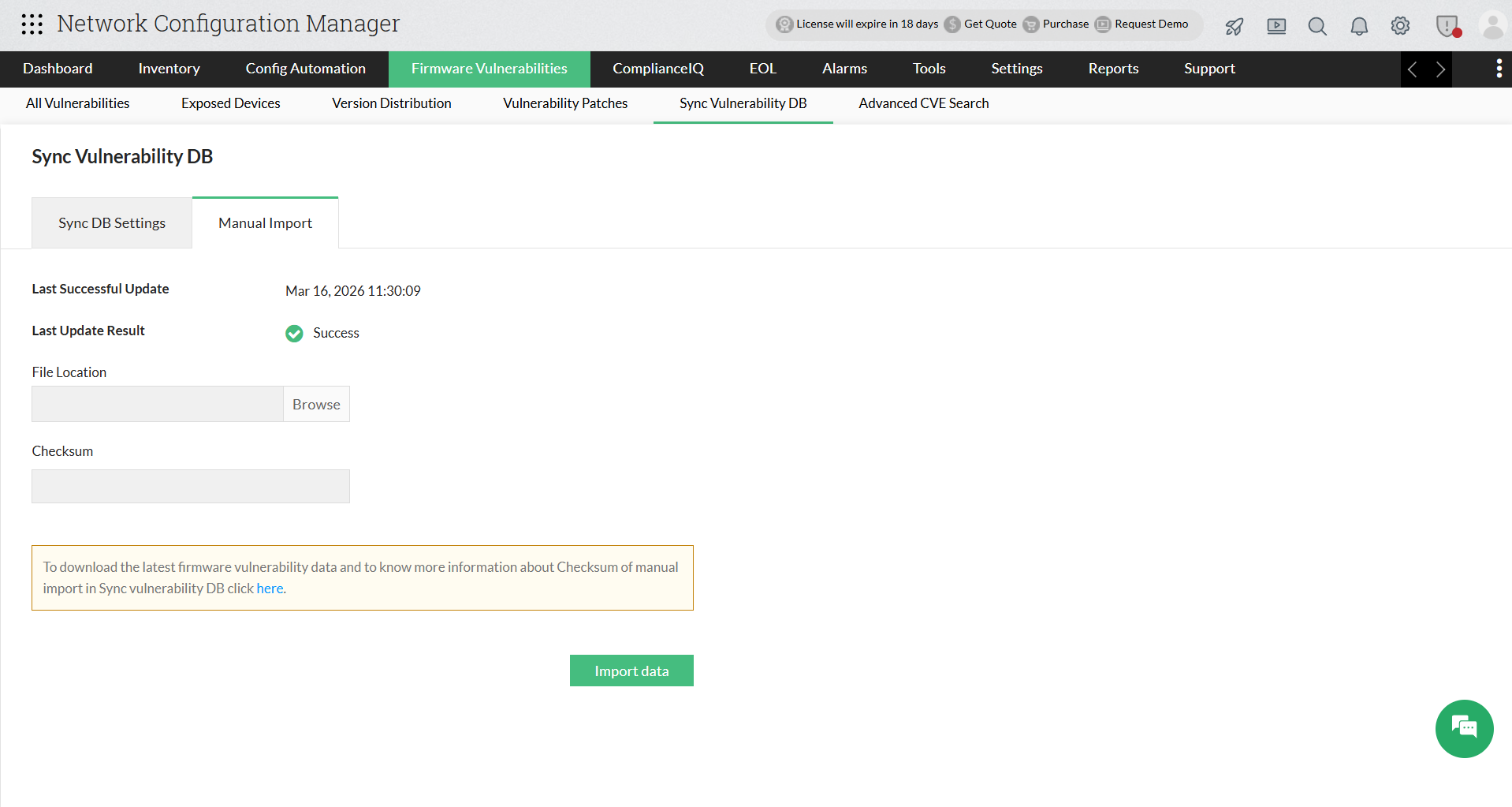 If your network is closed, you will not be able to update vulnerability database automatically using firmware vulnerability scanning with data from NIST vulnerability management. In that case, you can go for a manual import of vulnerability data.