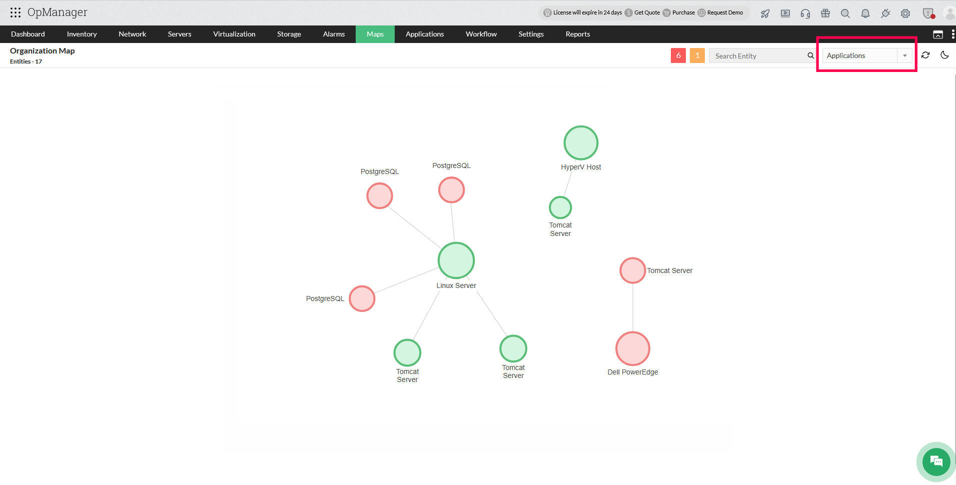 OpManager devices that have associated Application monitors will be listed together in the Organization Map, giving you a clear picture of which applications are tied to which devices. This makes it much easier to spot the source of an application performance issue and understand its impact on your network.