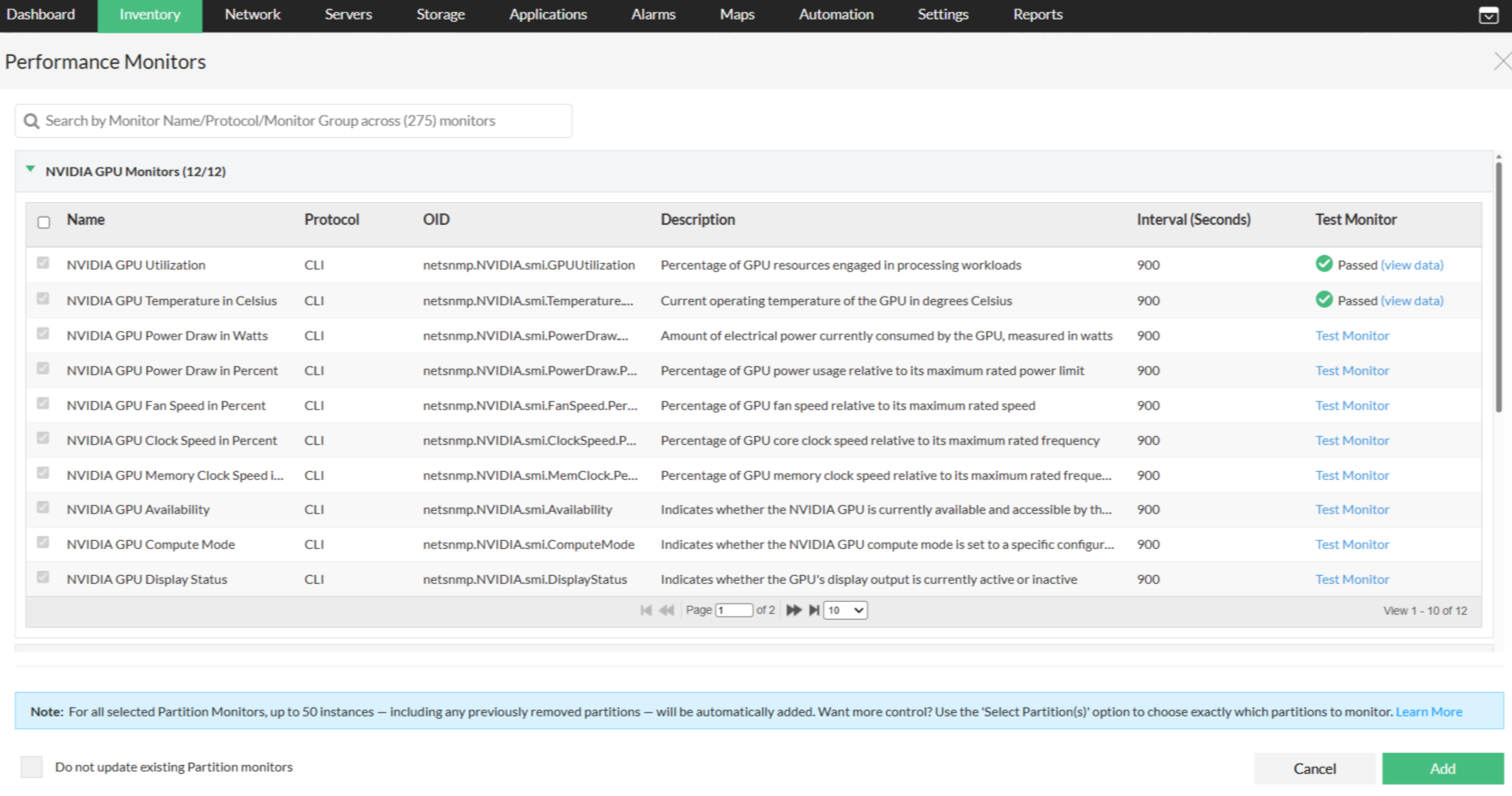 Here, monitors are listed in the "NVIDIA GPU Monitors" section. Select the monitors required, and click on Add.