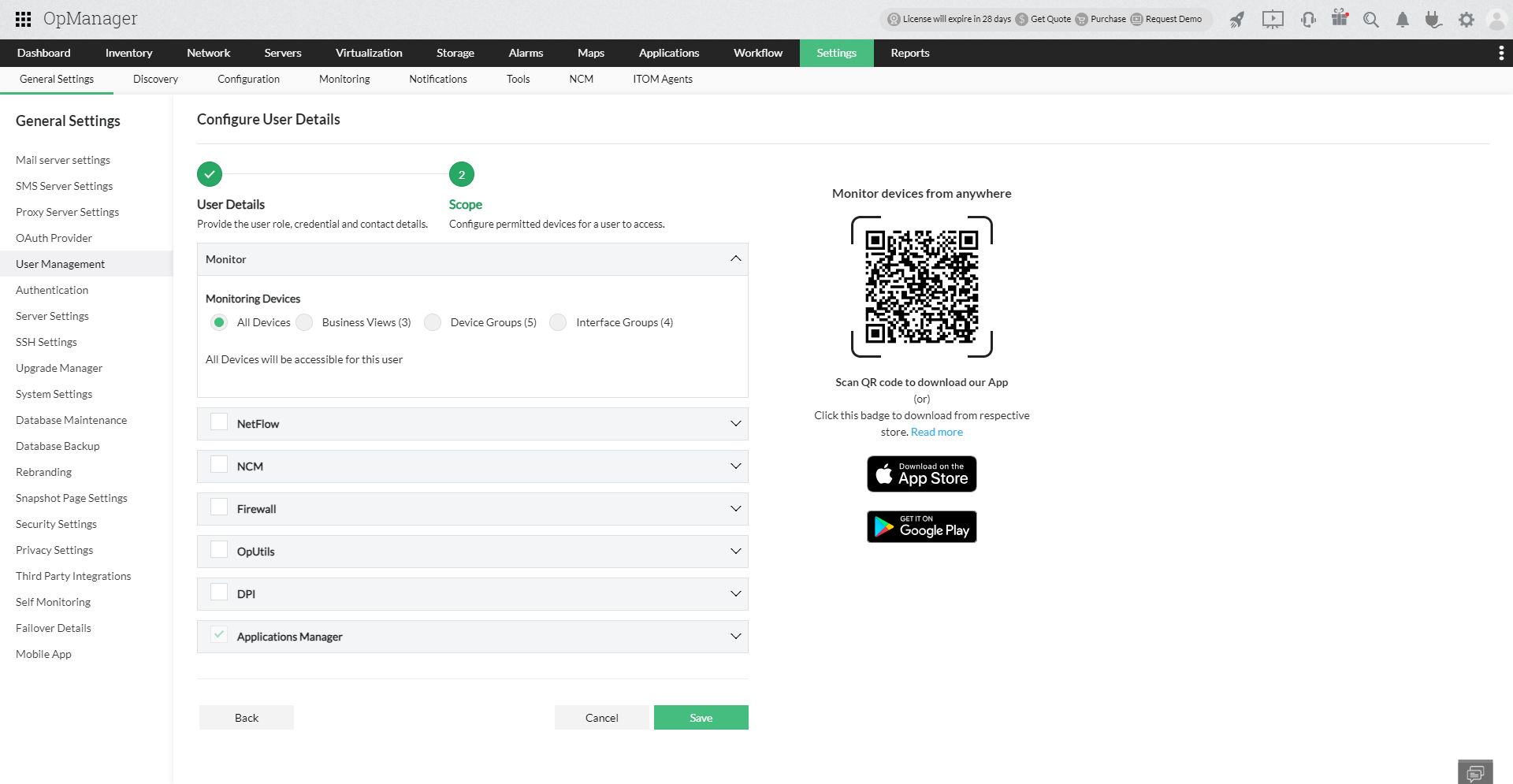 OpManager's user management feature helps you maintain stringent access control over your network. You can configure user roles with access to specific functionalities. You can later create user profiles and associate them with the respective user roles.