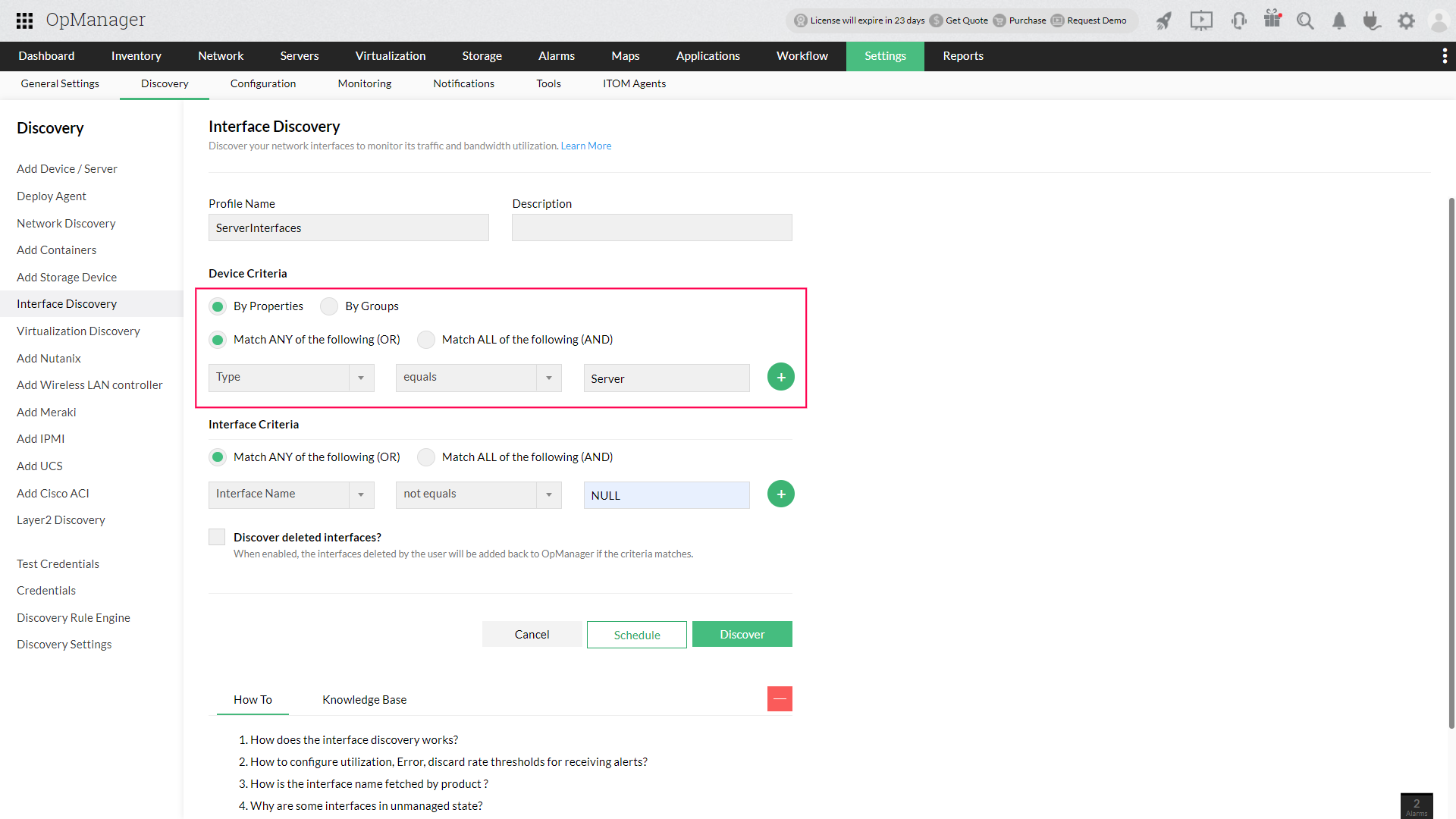 - To discover the interfaces according to the configured conditions and criteria immediately, click on Discover. to discover them later, click on Schedule. To know more about scheduling interface discovery, click here.