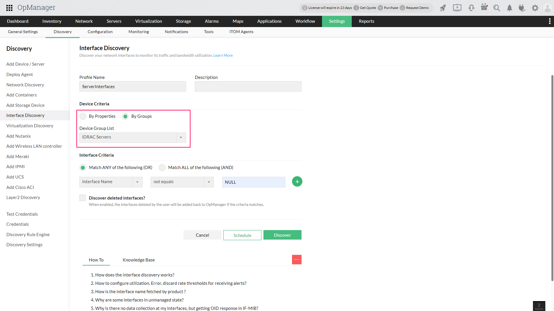 - Schedule the discovery process or execute it then. The associated interfaces that match the specified condition will now be discovered along with the devices in OpManager.