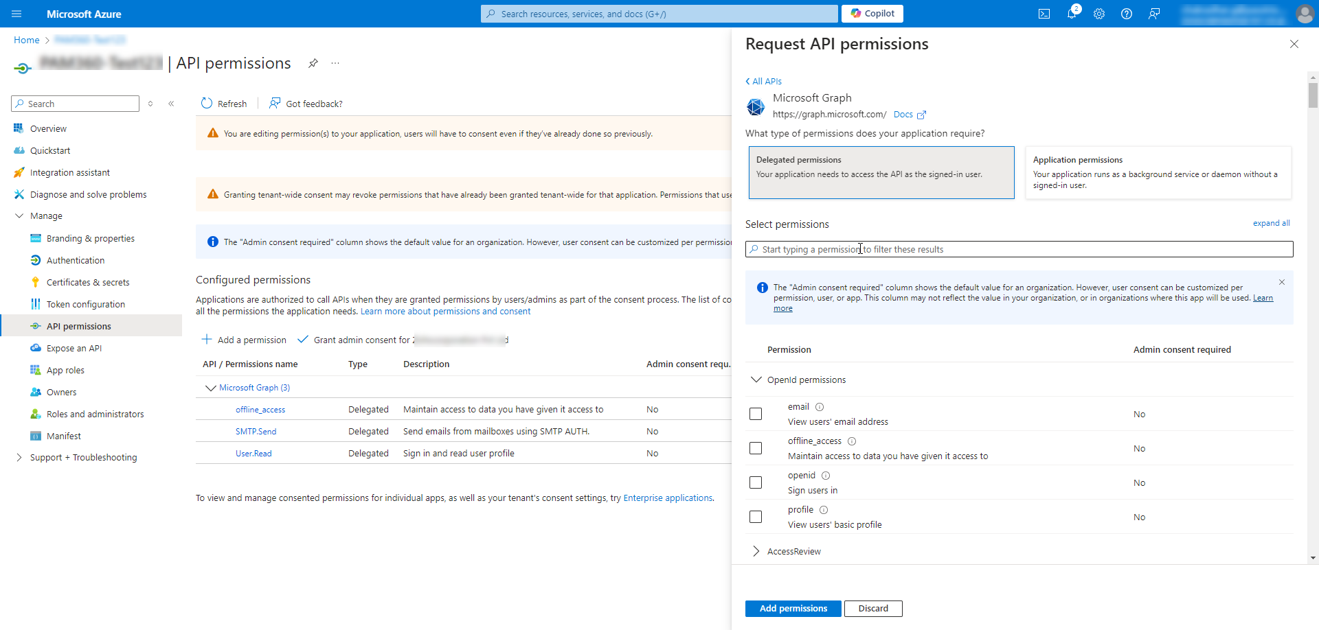 - On the Request API Permissions page, choose Microsoft Graph >> Delegated permissions.