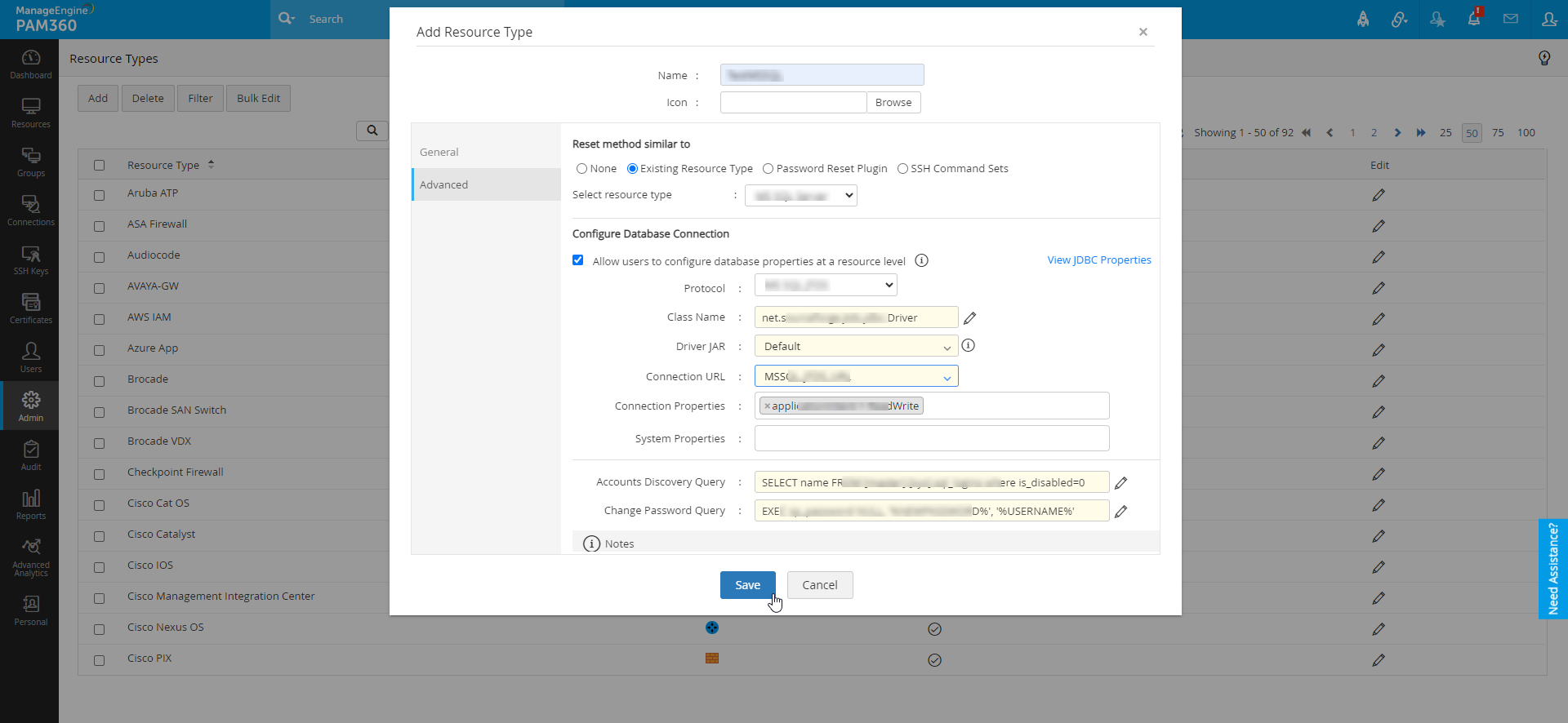 8. Furthermore, users have the flexibility to choose any resource type from the database servers category and tailor it according to their needs. You can even create a NoSQL server or other SQL server that supports JDBC with custom database attributes. The customized values will be applied during password reset, password verification, account discovery, and SQL autologon session processes. To learn how to create and configure custom database resource types, click here.