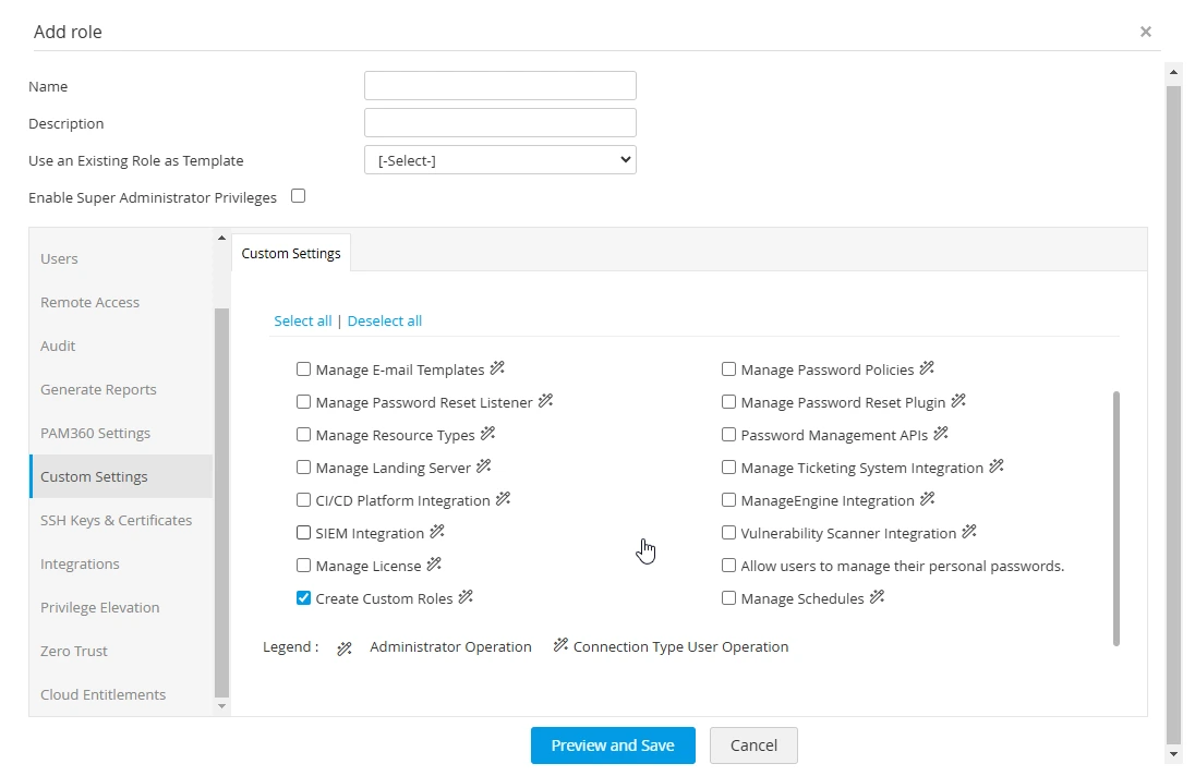 While creating a custom user role, ensure that you select the operations for the role as required. The operations with the magic wand icon beside is of administrator privilege. Selecting those operations for a custom role consider it in the administrator category and creating the user accounts with this user role might affect your PAM360 license counts.