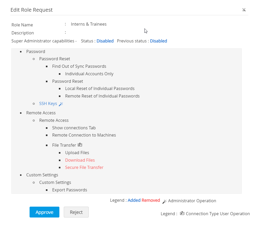 To edit a custom role, click the Edit icon next to the respective role, make necessary modifications, and click Preview and Save. Verify the modifications once and click Save. The edits undergo an approval process by another administrator before implementation. Edits pending for approval will be shown with the status [Waiting for approval] beside the specific role. In the below image, red denotes operations that have been removed in the edit, and blue denotes operations that have been added to the role.