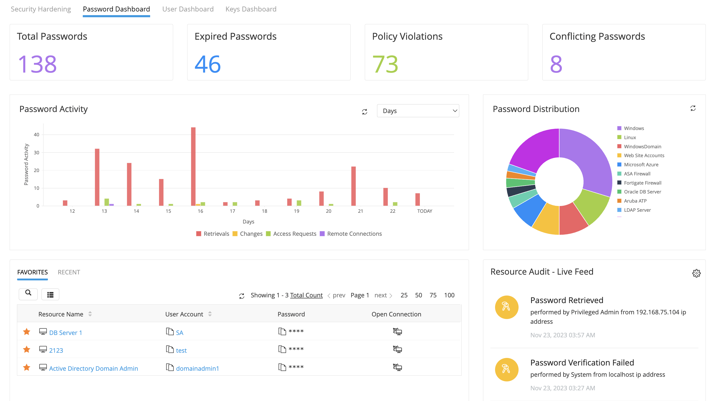 With a multitude of tasks performed under every enterprise's privileged access management (PAM) routine, PAM360's interactive dashboards provide real-time insights into the security configurations and distribution of privileged access activities across various domains of its infrastructure.