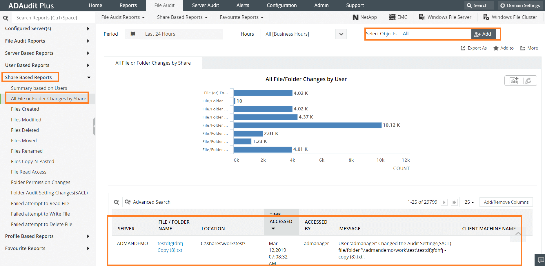 ADAudit Plus offers reports that pull up changes made to your files/folders with complete details in a single click. These reports can be exported in any format such as CSV, PDF, XML etc. Real-time alerts can be sent to your e-mail or phone so that you can be notified when changes are made to a critical file or folder. Here is how you can access these reports: