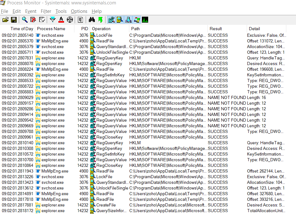 ProcMon captures thousands of events, and tracks all of them in real time. The best way to use ProcMon is to use the readily available filters, and zero-in on the events of interest.