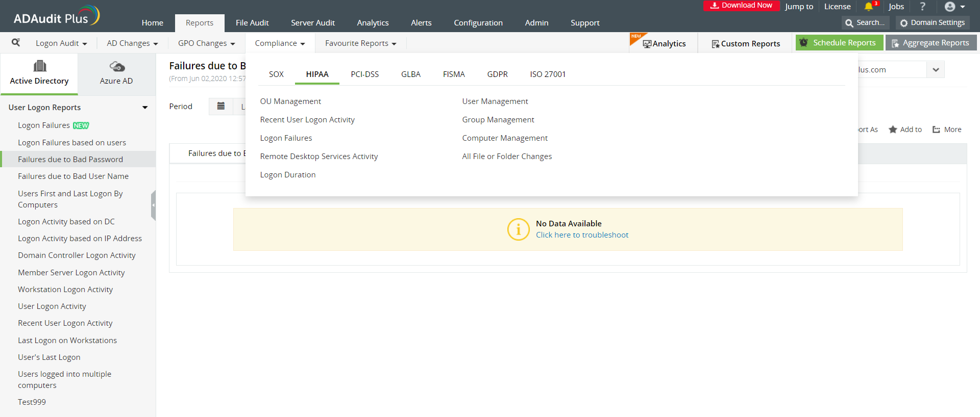 Reports available in ADAudit Plus to help you comply with the HIPAA: