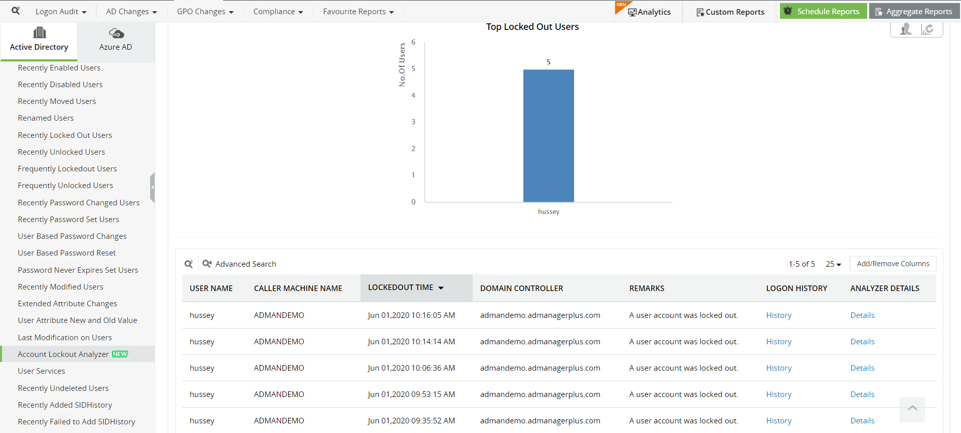 Image: ADAudit Plus' pre-configured report on Account Lockouts gives you a detailed look at reasons for account lockout.