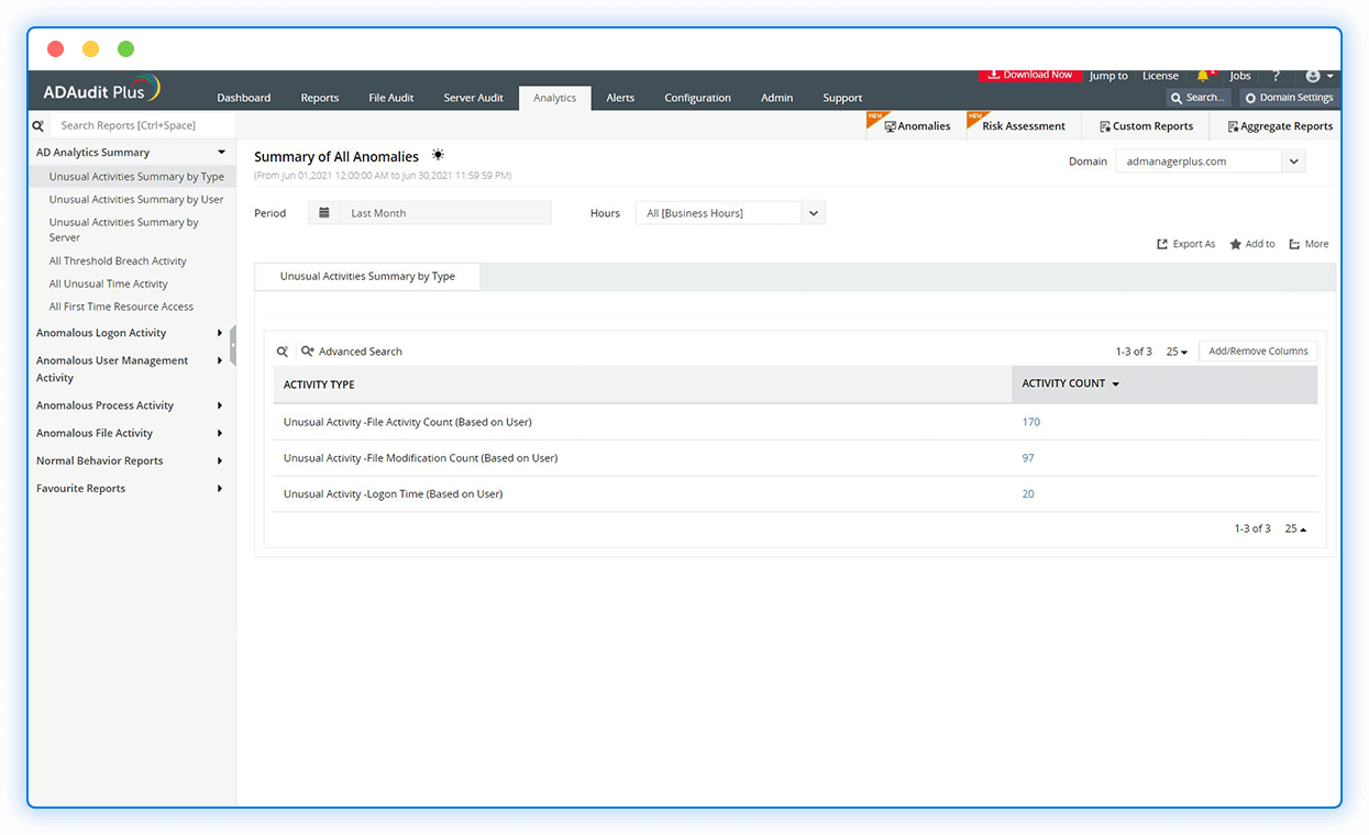 Detect user behavior that deviates from their normal pattern, such as a sudden spike in AD changes, unusual access time, and others, utilizing machine learning.