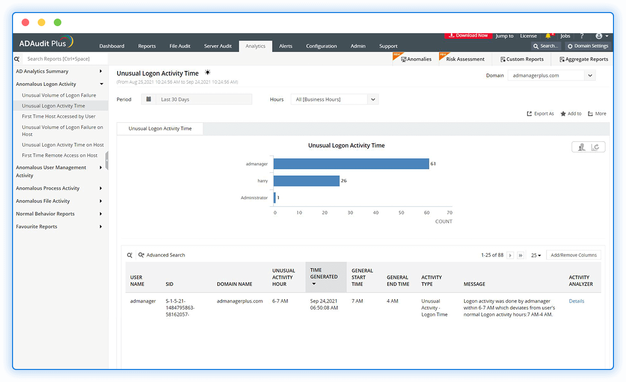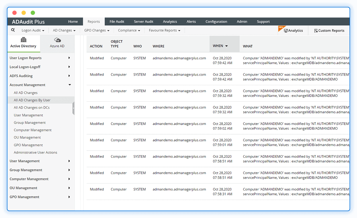 More than just an employee hours calculator, ADAudit Plus helps you gain visibility into your users' activities across AD, Azure AD, workstations, Windows servers, and file servers.
