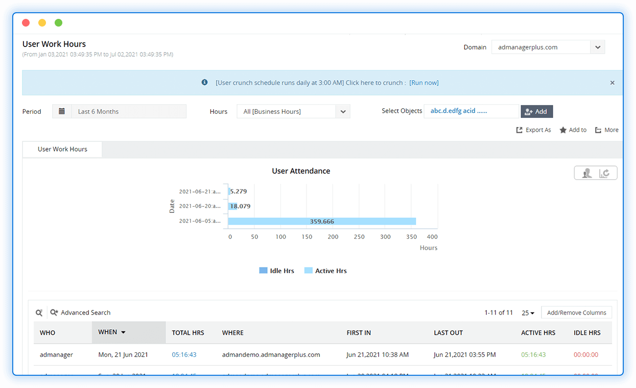 Analyze computer startup and shut down times, active and idle hours, screensaver start and stop times, and other metrics to measure employee productivity.