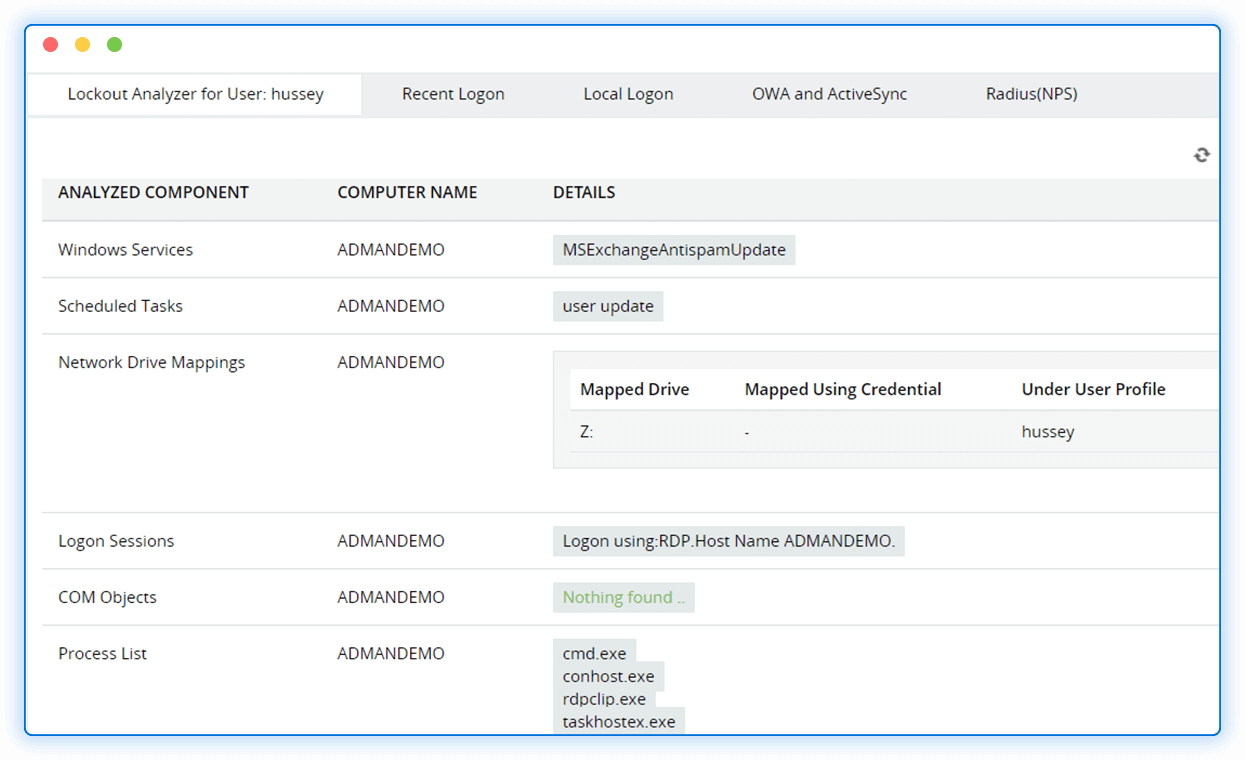Track the source of outdated credentials by scrutinizing the extensive list of Windows components such as processes, services, applications, scheduled tasks, and more.